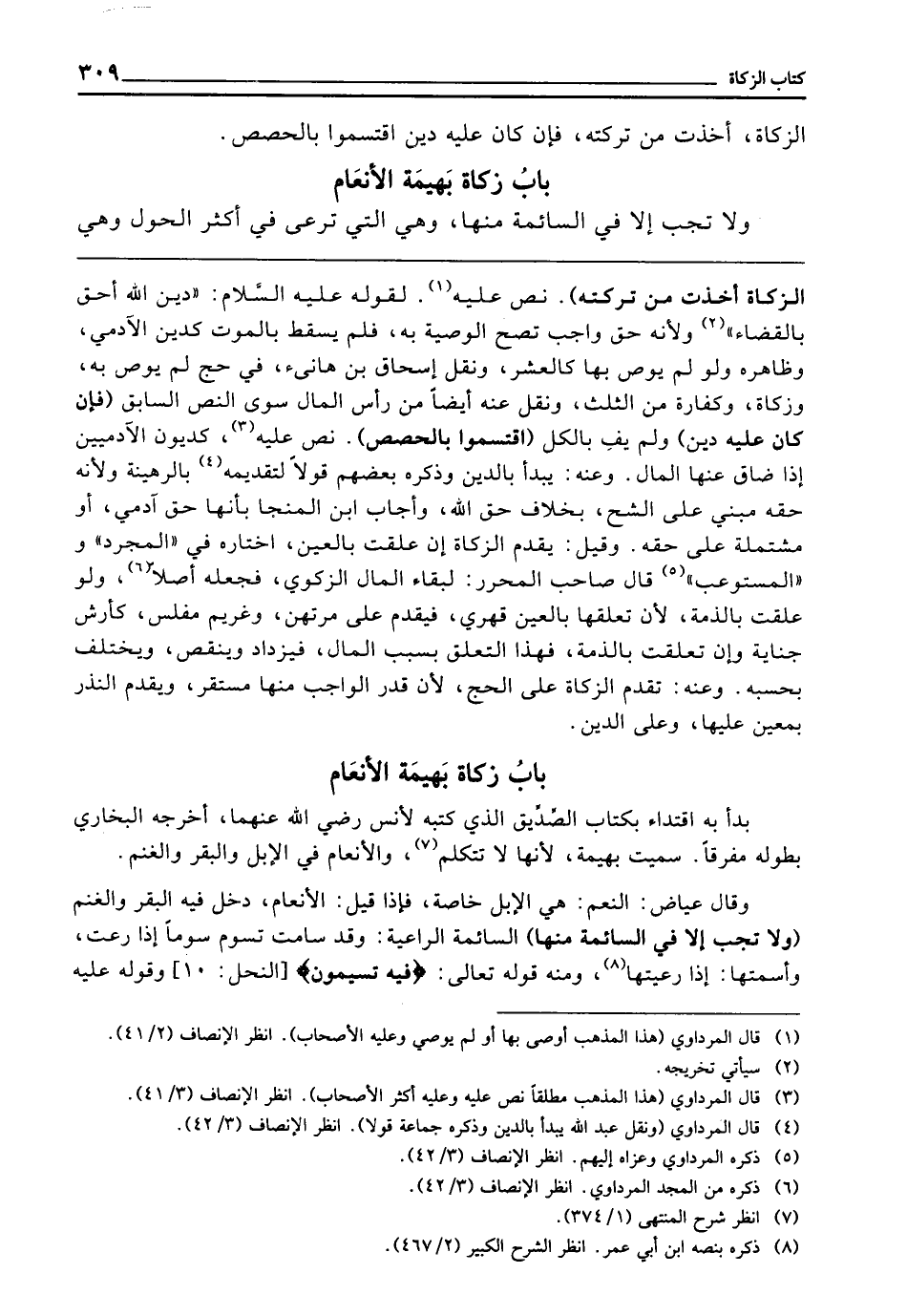 بَدَأَ بِهِ اقتداء بِكِتَابِ الصِّدِّيقِ الَّذِي كَتَبَهُ لِأَنَسٍ - رَضِيَ اللَّهُ عَنْهُمَا -، أَخْرَجَهُ الْبُخَارِيُّ بِطُولِهِ مُفَرَّقًا. سُمِّيَتْ بَهِيمَةً؛ لِأَنَّهَا لَا تَتَكَلَّمُ، وَالْأَنْعَامُ فِي الْإِبِلِ وَالْبَقَرِ وَالْغَنَمِ.