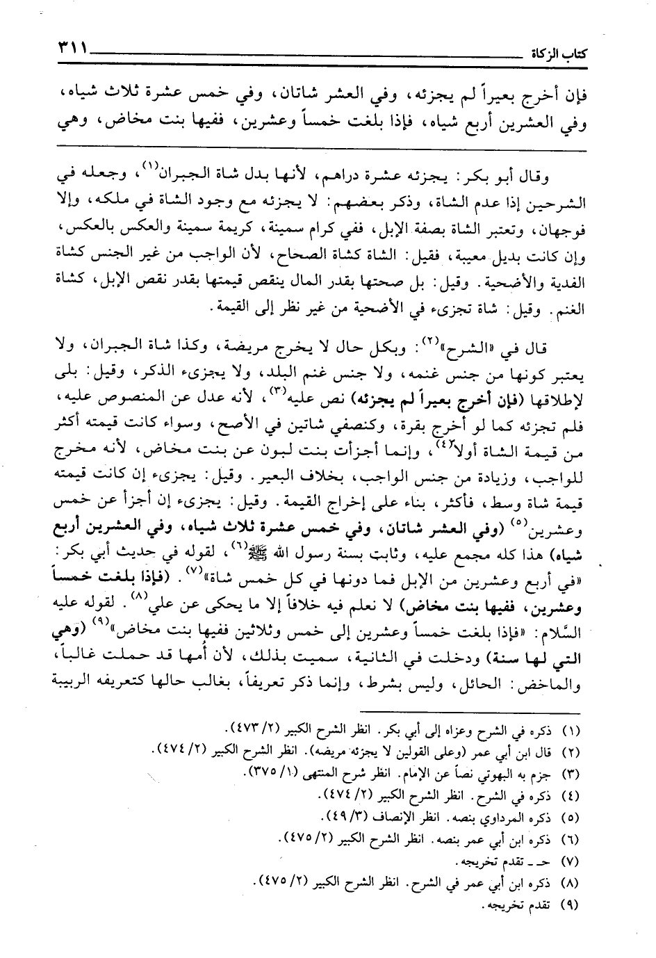 قَالَ فِي " الشَّرْحِ ": وَبِكُلِّ حَالٍ لَا يُخْرِجُ مَرِيضَةً، وَكَذَا شَاةُ الْجُبْرَانِ، وَلَا يُعْتَبَرُ كَوْنُهَا مِنْ جِنْسِ غَنَمِهِ، وَلَا جِنْسِ غَنَمِ الْبَلَدِ، وَلَا يُجْزِئُ الذَّكَرُ، وَقِيلَ: بَلَى لِإِطْلَاقِهَا (فَإِنْ أَخْرَجَ بَعِيرًا لَمْ يُجْزِئْهُ) نَصَّ عَلَيْهِ؛ لِأَنَّهُ عَدَلَ عَنِ الْمَنْصُوصِ عَلَيْهِ، فَلَمْ تُجْزِئْهُ، كَمَا لَوْ أَخْرَجَ بَقَرَةً، وَكَنِصْفَيْ شَاتَيْنِ فِي الْأَصَحِّ، وَسَوَاءٌ كَانَتْ قِيمَتُهُ أَكْثَرَ مِنْ قِيمَةِ الشَّاةِ أَوَّ لًا، وَإِنَّمَا أَجْزَأَتْ بِنْتُ لَبُونٍ عَنْ بِنْتِ مَخَاضٍ؛ لِأَنَّهُ مُخْرِجٌ لِلْوَاجِبِ، وَزِيَادَةٍ مِنْ جِنْسِ الْوَاجِبِ، بِخِلَافِ الْبَعِيرِ، وَقِيلَ: يُجْزِئُ إِنْ كَانَتْ قِيمَتُهُ قِيمَةَ شَاةٍ وَسَطٍ فَأَكْثَرَ، بِنَاءً عَلَى إِخْرَاجِ الْقِيمَةِ، وَقِيلَ: يُجْزِئُ إِنْ أَجْزَأَ عَنْ خَمْسٍ وَعِشْرِينَ (وَفِي الْعَشْرِ شَاتَانِ، وَفِي خَمْسَ عَشَرَةَ ثَلَاثُ شِيَاهٍ، وَفِي الْعِشْرِينَ أَرْبَعُ شِيَاهٍ) هَذَا كُلُّهُ مُجْمَعٌ عَلَيْهِ، وَثَابِتٌ بِسُنَّةِ رَسُولِ اللَّهِ - صَلَّى اللَّهُ عَلَيْهِ وَسَلَّمَ -؛ لِقَوْلِهِ فِي حَدِيثِ أَبِي بَكْرٍ: «فِي أَرْبَعٍ وَعِشْرِينَ مِنَ الْإِبِلِ فَمَا دُونَهَا، فِي كُلِّ خَمْسٍ شَاةٌ» (فَإِذَا بَلَغَتْ خَمْسًا وَعِشْرِينَ فَفِيهَا بِنْتُ مَخَاضٍ) لَا نَعْلَمُ فِيهِ خِلَافًا إِلَّا مَا يُحْكَى عَنْ عَلِيٍّ؛ لِقَوْلِهِ - عَلَيْهِ السَّلَامُ -: «فَإِذَا بَلَغَتْ خَمْسًا وَعِشْرِينَ إِلَى خَمْسٍ وَثَلَاثِينَ فَفِيهَا بِنْتُ مَخَاضٍ» (وَهِيَ الَّتِي لَهَا سَنَةٌ) وَدَخَلَتْ فِي الثَّانِيَةِ، سُمِّيَتْ بِذَلِكَ؛ لِأَنَّ أُمَّهَا قَدْ حَمَلَتْ غَالِبًا، وَالْمَاخِضُ: الْحَائِلُ، وَلَيْسَ بِشَرْطٍ، وَإِنَّمَا ذُكِرَ تَعْرِيفًا بِغَالِبِ حَالِهَا، كَتَعْرِيفِهِ الرَّبِيبَةَ