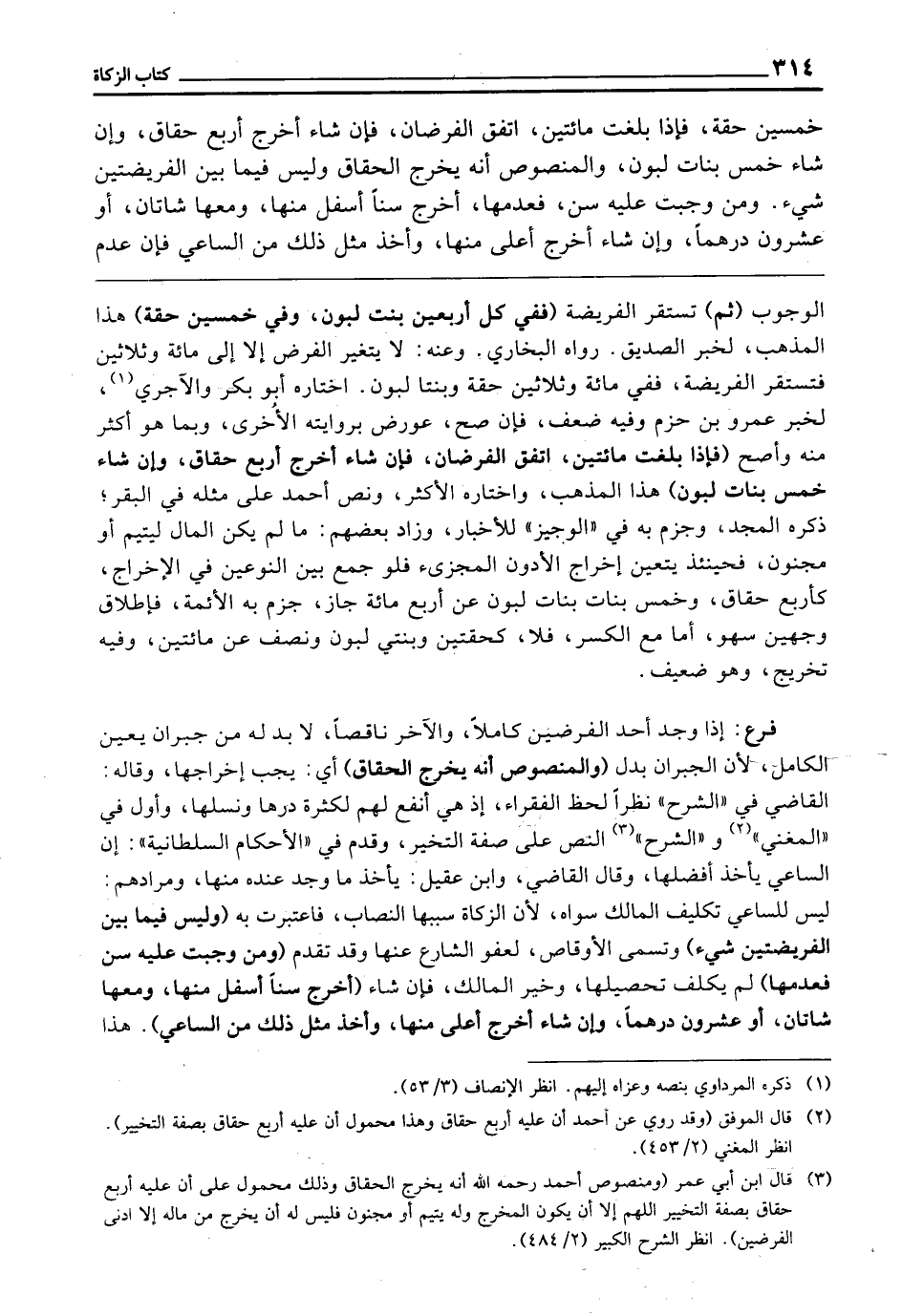 ـــــــــــــــــــــــــــــQالْوُجُوبُ (ثُمَّ) تَسْتَقِرُّ الْفَرِيضَةُ (فَفِي كُلِّ أَرْبَعِينَ بِنْتُ لَبُونٍ، وَفِي خَمْسِينَ حِقَّةٌ) هَذَا الْمَذْهَبُ لِخَبَرِ الصِّدِّيقِ. رَوَاهُ الْبُخَارِيُّ، وَعَنْهُ: لَا يَتَغَيَّرُ الْفَرْضُ إِلَّا إِلَى مِائَةٍ وَثَلَاثِينَ فَتَسْتَقِرُّ الْفَرِيضَةُ، فَفِي مِائَةٍ وَثَلَاثِينَ حِقَّةٌ وَبِنْتَا لَبُونٍ، اخْتَارَهُ أَبُو بَكْرٍ وَالْآجُرِّيُّ، لِخَبَرِ عَمْرِو بْنِ حَزْمٍ، وَفِيهِ ضَعْفٌ، فَإِنْ صَحَّ، عُورِضَ بِرِوَايَتِهِ الْأُخْرَى، وَبَّمَا هو أَكْثَرُ مِنْهُ، وَأَصَحُّ (فَإِذَا بَلَغَتْ مِائَتَيْنِ، اتَّفَقَ الْفَرْضَانِ، فَإِنْ شَاءَ أَخْرَجَ أَرْبَعَ حِقَاقٍ، وَإِنْ شَاءَ خَمْسَ بَنَاتِ لَبُونٍ) هَذَا الْمَذْهَبِ، وَاخْتَارَهُ الْأَكْثَرُ، وَنَصَّ أَحْمَدُ عَلَى مِثْلِهِ فِي الْبَقَرِ. ذَكَرَهُ الْمَجْدُ، وَجَزَمَ بِهِ فِي " الْوَجِيزِ " لِلْأَخْبَارِ، وَزَادَ بَعْضُهُمْ: مَا لَمْ يَكُنِ الْمَالُ لِيَتِيمٍ أَوْ مَجْنُونٍ، فَحِينَئِذٍ يَتَعَيَّنُ إِخْرَاجُ الْأَدْوَنِ الْمُجْزِئِ، فَلَوْ جُمِعَ بَيْنَ النَّوْعَيْنِ فِي الْإِخْرَاجِ، كَأَرْبَعِ حِقَاقٍ، وَخَمْسِ بَنَاتِ لَبُونٍ عَنْ أَرْبَعِمِائَةٍ جَازَ، جَزَمَ بِهِ الْأَئِمَّةُ، فَإِطْلَاقُ وَجْهَيْنِ سَهْوٌ، أَمَّا مَعَ الْكَسْرِ، فَلَا، كَحِقَّتَيْنِ وَبِنْتَيْ لَبُونٍ وَنِصْفٍ عَنْ مِائَتَيْنِ، وَفِيهِ تَخْرِيجٌ؛ وَهُوَ ضَعْفٌ.