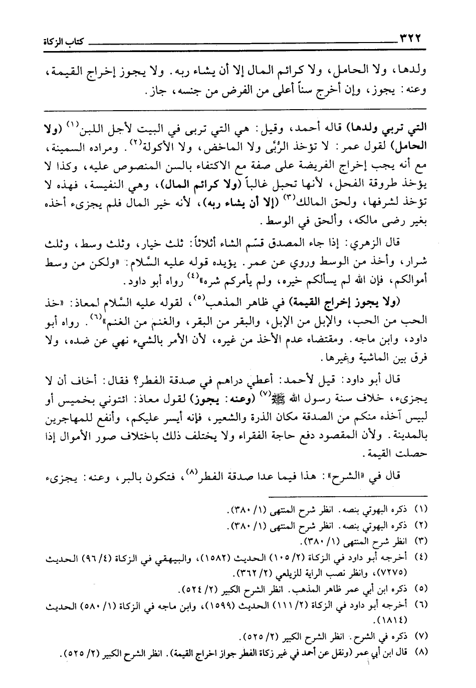 ـــــــــــــــــــــــــــــQالَّتِي تُرَبِّي وَلَدَهَا) قَالَهُ أَحْمَدُ، وَقِيلَ: هِيَ الَّتِي تُرَبَّى فِي الْبَيْتِ لِأَجْلِ اللَّبَنِ (وَلَا الْحَامِلُ) لِقَوْلِ عُمَرَ: لَا تُؤْخَذُ الرُّبَّى وَلَا الْمَاخِضُ وَلَا الْأَكُولَةُ، وَمُرَادُهُ السَّمِينَةُ، مَعَ أَنَّهُ يَجِبُ إِخْرَاجُ الْفَرِيضَةِ عَلَى صِفَةٍ مَعَ الِاكْتِفَاءِ بِالسِّنِّ الْمَنْصُوصِ عَلَيْهِ، وَكَذَا لَا يُؤْخَذُ طَرُوقَةُ الْفَحْلُ؛ لِأَنَّهَا تَحْبَلُ غَالِبًا (وَلَا كَرَائِمُ الْمَالِ) وَهِيَ النَّفِيسَةُ، فَهَذِهِ لَا تُؤْخَذُ لِشَرَفِهَا، وَلِحَقِّ الْمَالِكِ (إِلَّا أَنْ يَشَاءَ رَبُّهُ) ؛ لِأَنَّهُ خَيْرُ الْمَالِ، فَلَمْ يُجْزِئْ أَخْذُهُ بِغَيْرِ رِضَى مَالِكِهِ، وَالْحَقُّ فِي الْوَسَطِ.