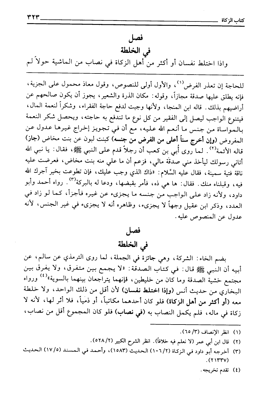فِي الْخُلْطَةِ وَإِذَا اخْتَلَطَ نَفْسَانِ، أَوْ أَكْثَرُ، مِنْ أَهْلِ الزَّكَاةِ، فِي نِصَابٍ مِنَ الْمَاشِيَةِ حَوْلًا، لَمْ
