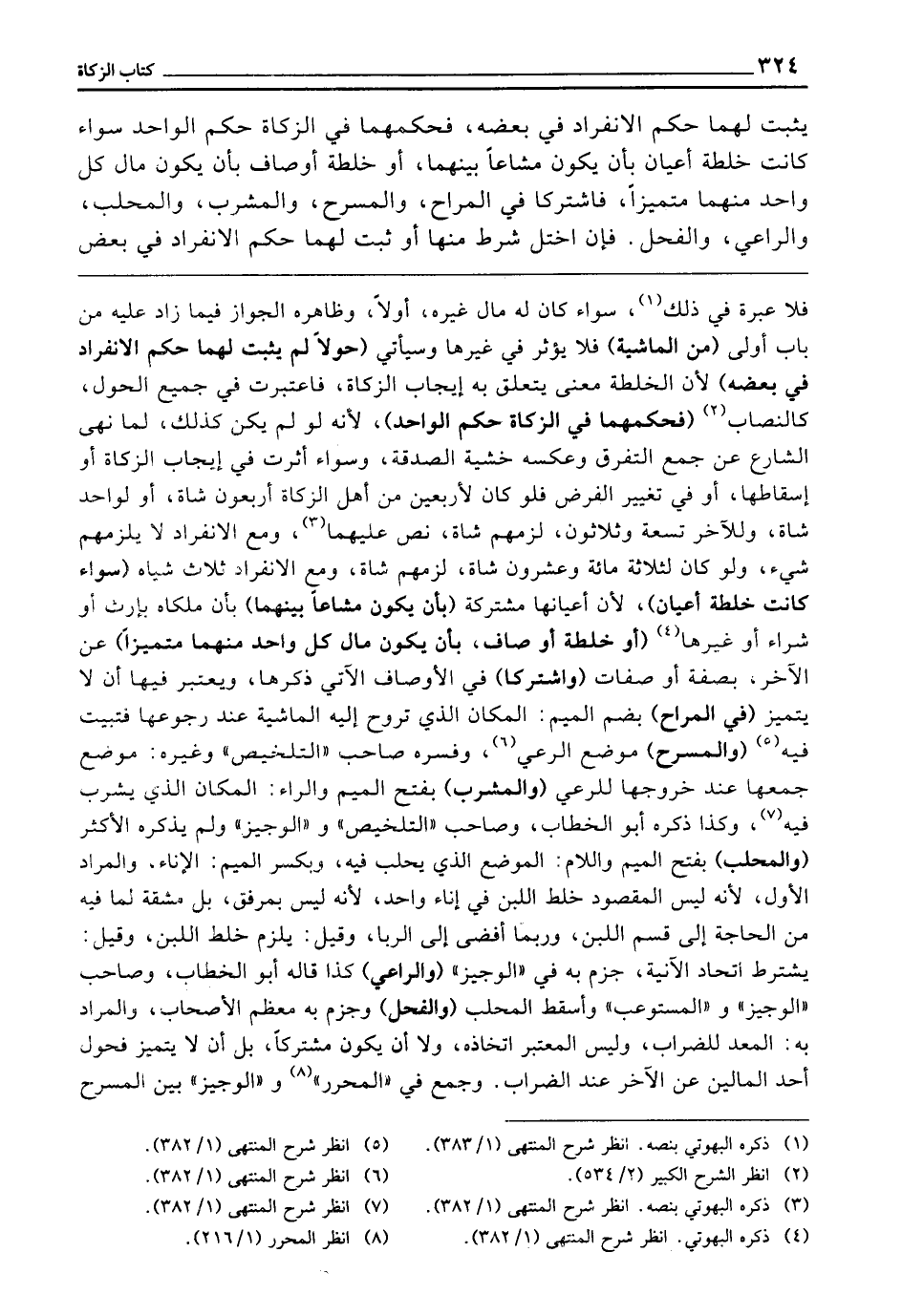 ـــــــــــــــــــــــــــــQفَلَا عِبْرَةَ فِي ذَلِكَ، سَوَاءٌ كَانَ لَهُ مَالٌ غَيْرَهُ أَوْ لَا، وَظَاهِرُهُ الْجَوَازُ فِيمَا زَادَ عَلَيْهِ مِنْ بَابِ أَوْلَى (مِنَ الْمَاشِيَةِ) فَلَا يُؤَثِّرُ فِي غَيْرِهَا، وَسَيَأْتِي (حَوْلًا لَمْ يَثْبُتْ لَهَما حُكْمُ الِانْفِرَادِ فِي بَعْضِهِ) ؛ لِأَنَّ الْخُلْطَةَ مَعْنًى يَتَعَلَّقُ بِهِ إِيجَابُ الزَّكَاةِ، فَاعْتُبِرَتْ فِي جَمِيعِ الْحَوْلِ، كَالنِّصَابِ (فَحُكْمُهَما فِي الزَّكَاةِ حُكْمُ الْوَاحِدِ) ؛ لِأَنَّهُ لَوْ لَمْ يَكُنْ كَذَلِكَ، لَمَا نَهَى الشَّارِعُ عَنْ جَمْعِ التَّفَرُّقِ وَعَكْسِهِ خَشْيَةَ الصَّدَقَةِ، وَسَوَاءٌ أَثَّرَتْ فِي إِيجَابِ الزَّكَاةِ أَوْ إِسْقَاطِهَا، أَوْ فِي تَغْيِيرِ الْفَرْضِ، فَلَوْ كَانَ لِأَرْبَعِينَ مِنْ أَهْلِ الزَّكَاةِ أَرْبَعُونَ شَاةً، أَوْ لِوَاحِد شَاةٌ، وَلِلْآخَرِ تِسْعَةٌ وَثَلَاثُونَ لَزِمَهُمْ شَاةٌ، نَصَّ عَلَيْهِمَا، وَمَعَ الِانْفِرَادِ لَا يَلْزَمُهُمْ شَيْءٌ، وَلَوْ كَانَ لِثَلَاثَةٍ مِائَةٌ وَعِشْرُونَ شَاةً، لَزِمَهُمْ شَاةٌ، وَمَعَ الِانْفِرَادِ ثَلَاثُ شِيَاهٍ (سَوَاءٌ كَانَتْ خُلْطَةَ أَعْيَانٍ) ؛ لِأَنَّ أَعْيَانَهَا مُشْتَرِكَةٌ (بِأَنْ يَكُونَ مُشَاعًا بَيْنَهُمَا) بِأَنْ مَلَكَاهُ بِإِرْثٍ أَوْ شِرَاءٍ أَوْ غَيْرِهَا (أَوْ خُلْطَةَ أَوْصَافٍ بِأَنْ يَكُونَ مَالُ كُلِّ وَاحِدٍ مِنْهَما مُتَمَيِّزًا) عَنِ الْآخَرِ بِصِفَةٍ أَوْ صِفَاتٍ (وَاشْتَرَكَا) فِي الْأَوْصَافِ الْآتِي ذِكْرُهَا، وَيُعْتَبَرُ فِيهَا أَنْ لَا يَتَمَيَّزَ (فِي الْمُرَاحِ) بِضَمِّ الْمِيمِ: الْمَكَانُ الَّذِي تَرُوحُ إِلَيْهِ الْمَاشِيَةُ عِنْدَ رُجُوعِهَا فَتَبِيتُ فِيهِ، (وَالْمَسْرَحِ) مَوْضِعُ الرَّعْيِ، وَفَسَّرَهُ صَاحِبُ " التَّلْخِيصِ " وَغَيْرُهُ: مَوْضِعُ جَمْعِهَا عِنْدَ خُرُوجِهَا لِلرَّعْيِ (وَالْمَشْرَبِ) بِفَتْحِ الْمِيمِ وَالرَّاءِ: الْمَكَانُ الَّذِي يُشْرَبُ فِيهِ، وَكَذَا ذَكَرَهُ أَبُو الْخَطَّابِ وَصَاحِبُ " التَّلْخِيصِ "، وَ " الْوَجِيزِ "، وَلَمْ يَذْكُرْهُ الْأَكْثَرُ (وَالْمَحْلَبِ) بِفَتْحِ الْمِيمِ وَاللَّامِ: الْمَوْضِعُ الذي يُحْلَبُ فِيهِ، وَبِكَسْرِ الْمِيمِ: الْإِنَاءُ، وَالْمُرَادُ الْأَوَّلُ؛ لِأَنَّهُ لَيْسَ الْمَقْصُودُ خَلْطَ اللَّبَنِ فِي إِنَاءٍ وَاحِدٍ؛ لِأَنَّهُ لَيْسَ بِمَرْفَقٍ، بَلْ مَشَقَّةً لِمَا فِيهِ مِنَ الْحَاجَةِ إِلَى قَسْمِ اللَّبَنِ، وَرُبَّمَا أَفْضَى إِلَى الرِّبَا، وَقِيلَ: يَلْزَمُ خَلْطُ اللَّبَنِ، وَقِيلَ: يُشْتَرَطُ اتِّحَادُ الْآنِيَةِ، جَزَمَ بِهِ فِي " الْوَجِيزِ " (وَالرَّاعِي) كَذَا قَالَهُ أَبُو الْخَطَّابِ وَصَاحِبُ " الْوَجِيزِ " وَ " الْمُسْتَوْعِبِ " وَأَسْقَطَ الْمَحْلَبَ، (وَالْفَحْلِ) وجَزَمَ بِهِ مُعْظَمُ الْأَصْحَابِ، وَالْمُرَادُ بِهِ: الْمُعَدُّ لِلضَّرْبِ، وَلَيْسَ الْمُعْتَبَرُ اتِّخَاذَهُ، وَلَا أَنْ يَكُونَ مُشْتَرَكًا، بَلْ أَنْ لَا يَتَمَيَّزَ فُحُولُ الْمَالَيْنِ عَنِ الْآخَرِ عِنْدَ الضَّرْبِ. وَجَمَعَ فِي " الْمُحَرَّرِ " وَ " الْوَجِيزِ " بَيْنَ الْمَسْرَحِ