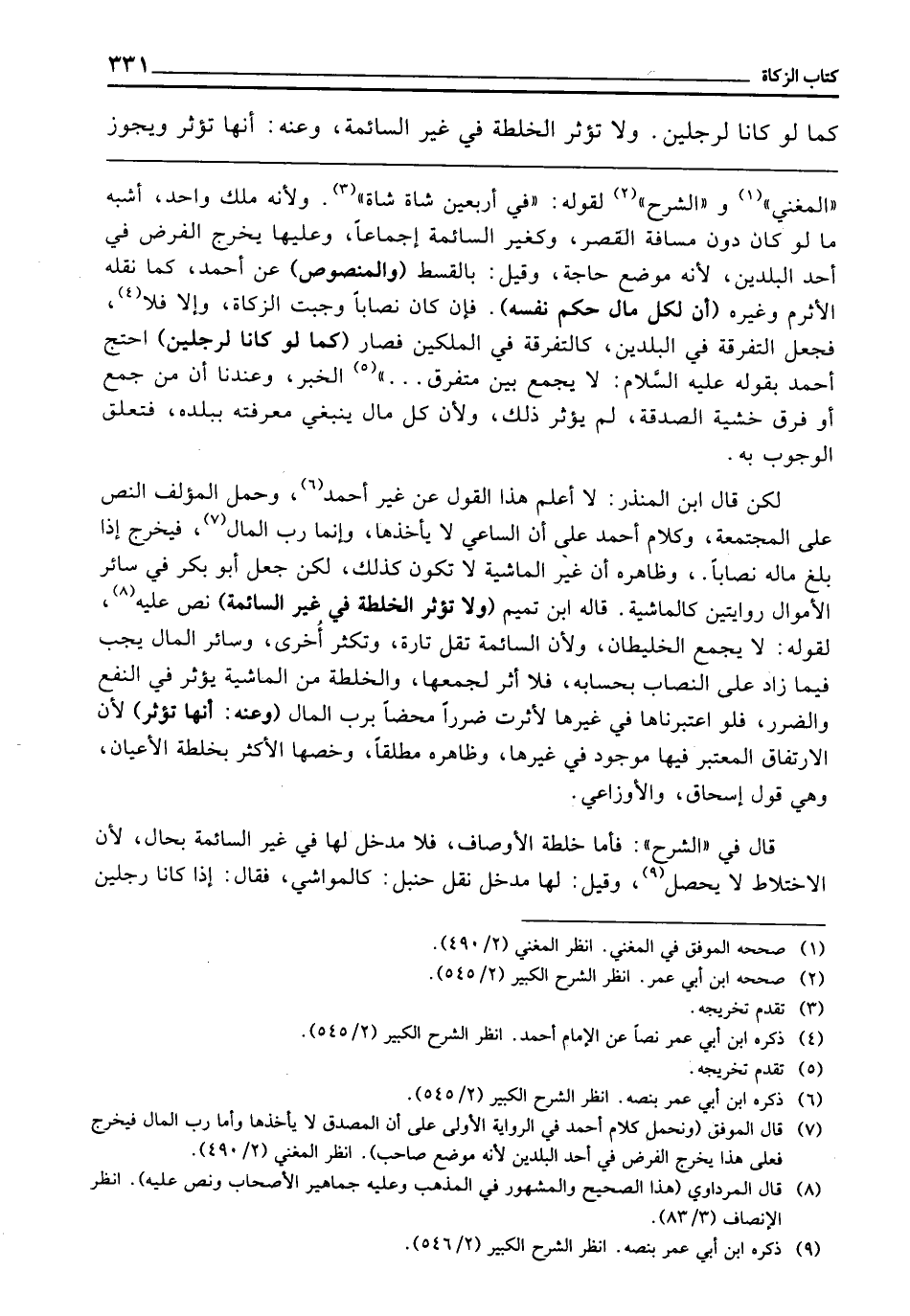 لَكِنْ قَالَ ابْنُ الْمُنْذِرِ: لَا أَعْلَمُ هَذَا الْقَوْلَ عَنْ غَيْرِ أَحْمَدَ، وَحَمَلَ الْمُؤَلِّفُ النَّصَّ عَلَى الْمُجْتَمِعَةِ، وَكَلَامَ أَحْمَدَ عَلَى أَنَّ السَّاعِيَ لَا يَأْخُذُهَا، وَإِنَّمَا رَبُّ الْمَالِ، فَيُخْرِجُ إِذَا بَلَغَ مَالُهُ نِصَابًا، وَظَاهِرُهُ أَنَّ غَيْرَ الْمَاشِيَةِ لَا تَكُونُ كَذَلِكَ، لَكِنْ جَعَلَ أَبُو بَكْرٍ فِي سَائِرِ الْأَمْوَالِ رِوَايَتَيْنِ كَالْمَاشِيَةِ، قَالَهُ ابْنُ تَمِيمٍ (وَلَا تُؤَثِّرُ الْخُلْطَةُ فِي غَيْرِ السَّائِمَةِ) نَصَّ عَلَيْهِ؛ لِقَوْلِهِ: لَا يُجْمَعُ الْخَلِيطَانِ؛ وَلِأَنَّ السَّائِمَةَ تَقِلُّ تَارَةً، وَتَكْثُرْ أُخْرَى، وَسَائِرُ الْمَالِ يَجِبُ فِيمَا زَادَ عَلَى النِّصَابِ بِحِسَابِهِ، فَلَا أَثَرَ لِجَمْعِهَا، وَالْخُلْطَةُ مِنَ الْمَاشِيَةِ يُؤَثِّرُ فِي النَّفْعِ وَالضَّرَرِ، فَلَوِ اعْتَبَرْنَاهُ فِي غَيْرِهَا لَأَثَّرَتْ ضَرَرًا مَحْضًا بِرَبِّ الْمَالِ (وَعَنْهُ: أَنَّهَا تُؤَثِّرُ) ؛ لِأَنَّ الِارْتِفَاقَ الْمُعْتَبَرَ فِيهَا مَوْجُودٌ فِي غَيْرِهَا، وَظَاهِرُهُ مُطْلَقًا، وَخَصَّهَا الْأَكْثَرُ بِخُلْطَةِ الْأَعْيَانِ؛ وَهِيَ قَوْلُ إِسْحَاقَ وَالْأَوْزَاعِيُّ.