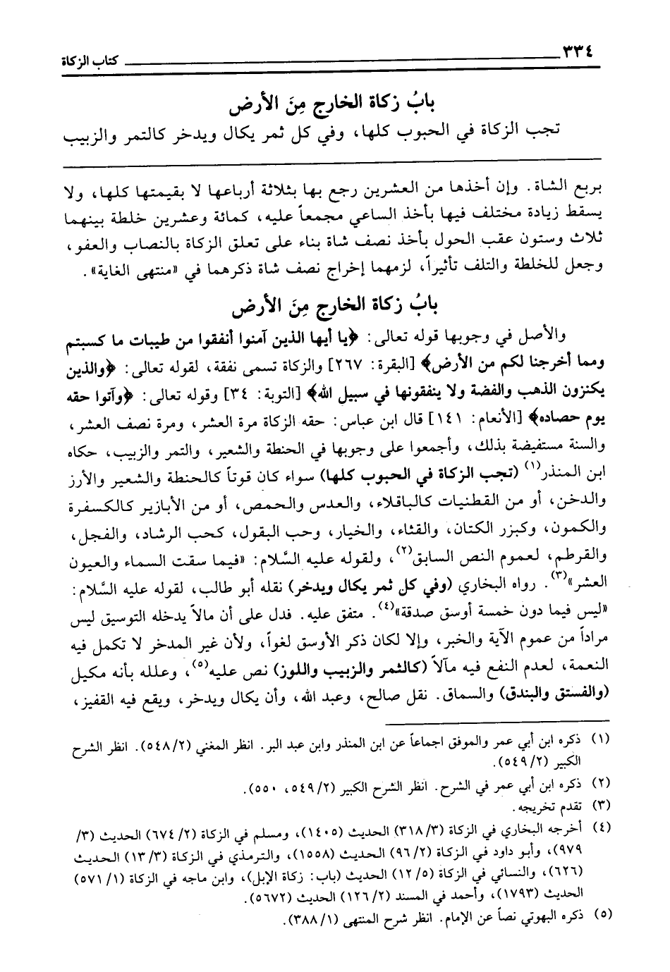 بَابُ زَكَاةِ الْخَارِجِ مِنَ الْأَرْضِ وَالْأَصْلُ فِي وُجُوبِهَا قَوْله تَعَالَى: {يَا أَيُّهَا الَّذِينَ آمَنُوا أَنْفِقُوا مِنْ طَيِّبَاتِ مَا كَسَبْتُمْ وَمِمَّا أَخْرَجْنَا لَكُمْ مِنَ الأَرْضِ} [البقرة: 267] وَالزَّكَاةُ تُسَمَّى نَفَقَةً؛ لِقَوْلِهِ تَعَالَى: {وَالَّذِينَ يَكْنِزُونَ الذَّهَبَ وَالْفِضَّةَ وَلا يُنْفِقُونَهَا فِي سَبِيلِ اللَّهِ} [التوبة: 34] وقَوْله تَعَالَى: {وَآتُوا حَقَّهُ يَوْمَ حَصَادِهِ} [الأنعام: 141] . قَالَ ابْنُ عَبَّاسٍ: حَقُّهُ الزَّكَاةُ، مَرَّةً الْعُشْرُ وَمَرَّةً نِصْفُ الْعُشْرِ، وَالسُّنَّةُ مُسْتَفِيضَةٌ بِذَلِكَ، وَأَجْمَعُوا عَلَى وُجُوبِهَا فِي الْحِنْطَةِ وَالشَّعِيرِ وَالتَّمْرِ وَالزَّبِيبِ. حَكَاهُ ابْنُ الْمُنْذِرِ (تَجِبُ الزَّكَاةُ فِي الْحُبُوبِ كُلِّهَا، سَوَاءٌ كَانَ قُوتًا كَالْحِنْطَةِ وَالشَّعِيرِ وَالْأُرْزِ وَالدُّخْنِ، أَوْ مِنَ الْقُطْنِيَّاتِ كَالْبَاقِلَاءِ وَالْعَدَسِ وَالْحِمَّصِ، أَوْ مِنَ الْأَبَازِيرِ كَالْكُسْفُرَةِ وَالْكَمُّونِ، وَكَبِزْرِ الْكَتَّانِ وَالْقِثَّاءِ وَالْخِيَارِ، وَحَبِّ الْبُقُولِ، كَحَبِّ الرَّشَادِ، وَالْفُجْلِ، وَالْقُرْطُمِ؛ لِعُمُومِ النَّصِّ السَّابِقِ، وَلِقَوْلِهِ - عَلَيْهِ السَّلَامُ -: " «فِيمَا سَقَتِ السَّمَاءُ وَالْعُيُونُ الْعُشْرُ» رَوَاهُ الْبُخَارِيُّ (وَفِي كُلِّ ثَمَرٍ يُكَالُ وَيُدَّخَرُ) نَقَلَهُ أَبُو طَالِبٍ؛ لِقَوْلِهِ - عَلَيْهِ السَّلَامُ -: " «لَيْسَ فِيمَا دُونَ خَمْسَةِ أَوْسُقٍ صَدَقَةٌ» مُتَّفَقٌ عَلَيْهِ. فَدَلَّ عَلَى أَنَّ مَا لَا يَدْخُلُهُ التَّوْسِيقُ لَيْسَ مُرَادًا مِنْ عُمُومِ الْآيَةِ وَالْخَبَرِ، وَإِلَّا لَكَانَ ذِكْرُ الْأَوْسُقِ لَغْوًا؛ وَلِأَنَّ غَيْرَ الْمُدَّخَرِ لَا تَكْمُلُ فِيهِ النِّعْمَةُ لِعَدَمِ النَّفْعِ فِيهِ مَآلًا (كَالثَّمَرِ وَالزَّبِيبِ وَاللَّوْزِ) نَصَّ عَلَيْهِ، وَعَلَّلَهُ بِأَنَّهُ مَكِيلٌ (وَالْفُسْتُقِ وَالْبُنْدُقِ) وَالسُّمَّاقُ. نَقَلَ صَالِحٌ، وَعَبْدُ اللَّهِ، وَأَنْ يُكَالَ وَيُدَّخَرَ، وَيَقَعُ فِيهِ الْقَفِيزُ،