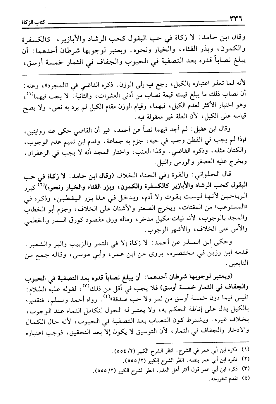 (وَيُعْتَبَرُ لِوُجُوبِهَا شَرْطَانِ، أَحَدُهُمَا: أَن يبلغ نصابا، قَدْرَهُ بَعْدَ التَّصْفِيَةِ فِي الْحُبُوبِ وَالْجَفَافِ فِي الثِّمَارِ خمسة أوسق) فَلَا يَجِبُ فِي أَقَلِّ مِنْ ذَلِكَ؛ لِقَوْلِهِ - عَلَيْهِ السَّلَامُ -: " «لَيْسَ فِيمَا دُونَ خَمْسَةِ أَوْسُقٍ مِنْ ثَمَرٍ وَلَا حَبٍّ صَدَقَةٌ» رَوَاهُ أَحْمَدُ، وَمُسْلِمٌ. فَتَقْدِيرُهُ بِالْكَيْلِ يَدُلُّ عَلَى إِنَاطَةِ الْحُكْمِ بِهِ، وَلَا يُعْتَبَرُ لَهُ الْحَوْلُ لِتَكَامُلِ النَّمَاءِ عِنْدَ الْوُجُوبِ، بِخِلَافِ غَيْرِهِ، وَيُشْتَرَطُ كَوْنُ النِّصَابِ بَعْدَ التَّصْفِيَةِ فِي الْحُبُوبِ؛ لِأَنَّهُ حَالُ الْكَمَالِ وَالِادِّخَارِ وَالْجَفَافِ فِي الثِّمَارِ؛ لِأَنَّ التَّوْسِيقَ لَا يَكُونُ إِلَّا بَعْدَ التَّحْقِيقِ، فَوَجَبَ اعْتِبَارُهُ