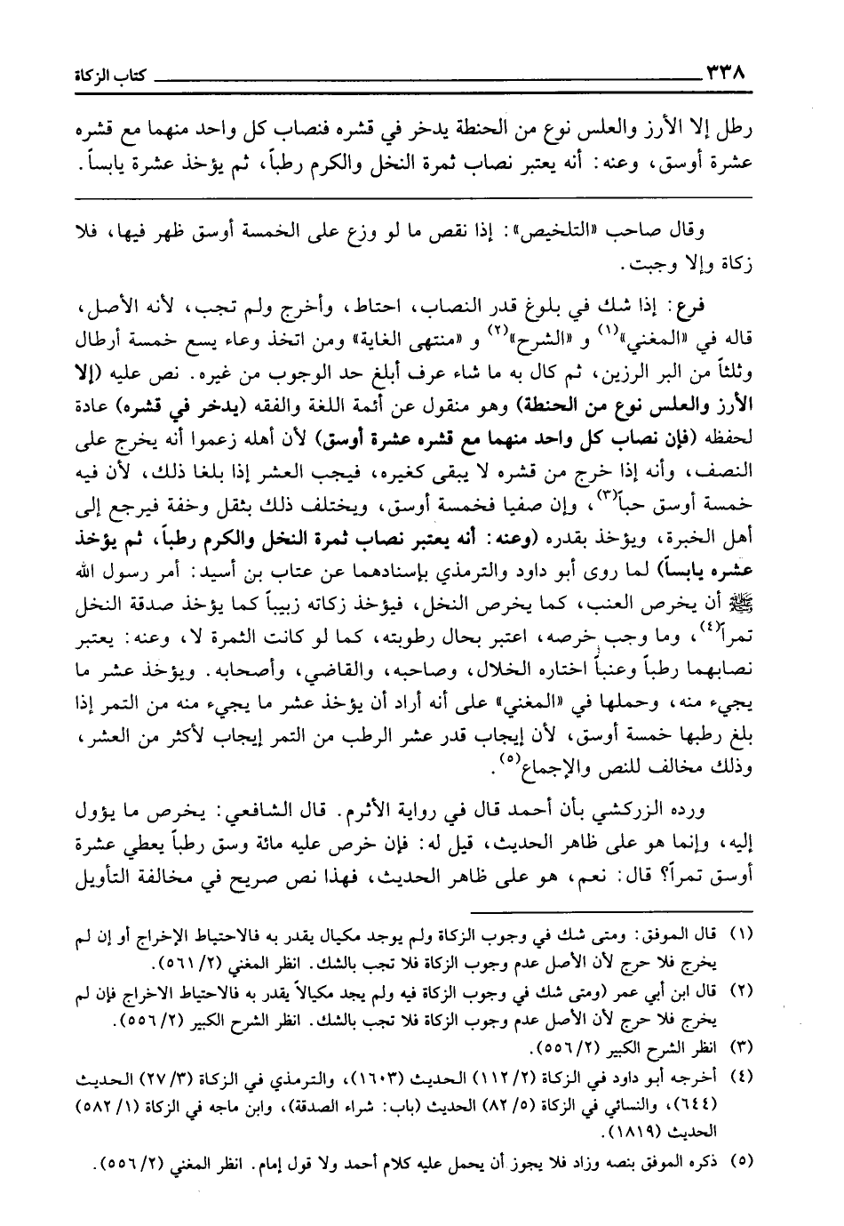 فَرْعٌ: إِذَا شَكَّ فِي بُلُوغِ قَدْرِ النِّصَابِ احْتَاطَ، وَأَخْرَجَ وَلَمْ تَجِبْ؛ لِأَنَّهُ الْأَصْلُ، قَالَهُ فِي " الْمُغْنِي " وَ " الشَّرْحِ " وَ " مُنْتَهَى الْغَايَةِ "، وَمَنِ اتَّخَذَ وِعَاءً يَسَعُ خَمْسَةَ أَرْطَالٍ وَثُلُثًا مِنَ الْبُرِّ الرَّزِينِ، ثُمَّ كَالَ بِهِ مَا شَاءَ، عَرَفَ أَبْلَغَ حَدِّ الْوُجُوبِ مِنْ غَيْرِهِ، نَصَّ عَلَيْهِ (إِلَّا الْأُرْزَ وَالْعَلَسَ نَوْعٌ مِنَ الْحِنْطَةِ) وَهُوَ مَنْقُولٌ عَنْ أَئِمَّةِ اللُّغَةِ وَالْفِقْهِ (يُدَّخَرُ فِي قِشْرِهِ) عَادَةً لِحِفْظِهِ (فَإِنَّ نِصَابَ كُلِّ وَاحِدٍ مِنْهُمَا مَعَ قِشْرِهِ عشرة أوسق) ؛ لِأَنَّ أَهْلَهُ زَعَمُوا أَنَّهُ يَخْرُجُ عَلَى النِّصْفِ، وَأَنَّهُ إِذَا خَرَجَ مِنْ قِشْرِهِ لَا يَبْقَى كَغَيْرِهِ، فَيَجِبُ الْعُشْرَ إِذَا بَلَغَا ذَلِكَ؛ لِأَنَّ فِيهِ خَمْسَةَ أَوْسُقٍ حَبًّا، وَإِنْ صُفِّيَا فَخَمْسَةُ أَوْسُقٍ، وَيَخْتَلِفُ ذَلِكَ بِثِقَلٍ وَخِفَّةٍ، فَيُرْجَعُ إِلَى أَهْلِ الْخِبْرَةِ، وَيُؤْخَذُ بِقَدْرِهِ (وَعَنْهُ: أَنَّهُ يُعْتَبَرُ نِصَابُ ثَمَرَةِ النَّخْلِ وَالْكَرْمِ رُطَبًا، ثُمَّ يُؤْخَذُ عُشْرُهُ يَابِسًا) لِمَا رَوَى أَبُو دَاوُدَ وَالتِّرْمِذِيُّ بِإِسْنَادِهِمَا عَنْ عَتَّابِ بْنِ أَسِيدٍ: «أَمْرَ رَسُولِ اللَّهِ - صَلَّى اللَّهُ عَلَيْهِ وَسَلَّمَ - أَنْ يُخْرَصَ الْعِنَبُ، كَمَا يُخْرَصُ النَّخْلُ، فَيُؤْخَذُ زَكَاتُهُ زَبِيبًا، كَمَا يُؤْخَذُ صَدَقَةُ النَّخْلِ تَمْرًا» "، وَمَا وَجَبَ خَرْصُهُ اعْتُبِرَ بِحَالِ رُطُوبَتِهِ، كَمَا لَوْ كَانَتِ الثَّمَرَةُ لَا، وَعَنْهُ: يُعْتَبَرُ نِصَابُهُمَا رُطَبًا وَعِنَبًا، اخْتَارَهُ الْخَلَّالُ وَصَاحِبُهُ، وَالْقَاضِي وَأَصْحَابُهُ، وَيُؤْخَذُ عُشْرُ مَا يَجِيءُ مِنْهُ، وَحَمَلَهَا فِي " الْمُغْنِي " عَلَى أَنَّهُ أَرَادَ أَنْ يُؤْخَذَ عُشْرُ مَا يَجِيءُ مِنْهُ مِنَ التَّمْرِ إِذَا بَلَغَ رُطَبُهَا خَمْسَةَ أَوْسُقٍ؛ لِأَنَّ إِيجَابَ قَدْرِ عُشْرِ الرُّطَبِ مِنَ التَّمْرِ إِيجَابٌ لِأَكْثَرِ مِنَ الْعُشْرِ، وَذَلِكَ مُخَالِفٌ لِلنَّصِّ وَالْإِجْمَاعِ.