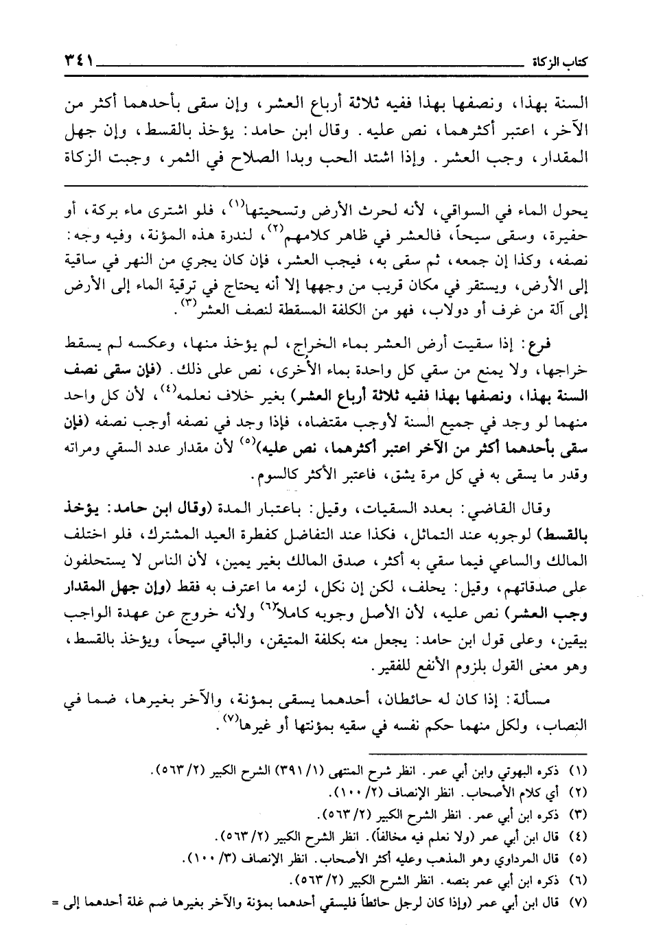 وَقَالَ الْقَاضِي: بِعَدَدِ السَّقْيَاتِ، وَقِيلَ: بِاعْتِبَارِ الْمُدَّةِ (وَقَالَ ابْنُ حَامِدٍ: يُؤْخَذُ بِالْقِسْطِ) لِوُجُوبِهِ عِنْدَ التَّمَاثُلِ، فَكَذَا عِنْدَ التَّفَاضُلِ كَفِطْرَةِ الْعِيدِ الْمُشْتَرَكِ، فَلَوِ اخْتَلَفَ الْمَالِكُ وَالسَّاعِي فِيمَا سُقِيَ بِهِ أَكْثَرَ، صَدَقَ الْمَالِكَ بِغَيْرِ يَمِينٍ؛ لِأَنَّ النَّاسَ لَا يُسْتَحْلَفُونَ عَلَى صَدَقَاتِهِمْ، وَقِيلَ: يَحْلِفُ، لَكِنْ إِنْ نَكَلَ، لَزِمَهُ مَا اعْتَرَفَ بِهِ فَقَطْ (وَإِنْ جَهِلَ الْمِقْدَارَ وَجَبَ الْعُشْرُ) نَصَّ عَلَيْهِ؛ لِأَنَّ الْأَصْلَ وُجُوبُهُ كَامِلًا؛ وَلِأَنَّهُ خُرُوجٌ عَنْ عُهْدَةِ الْوَاجِبِ بِيَقِينٍ، وَعَلَى قَوْلِ ابْنِ حَامِدٍ: يُجْعَلُ مِنْهُ بِكُلْفَةِ الْمُتَيَقِّنِ، وَالْبَاقِي سَيْحًا، وَيُؤْخَذُ بِالْقِسْطِ؛ وَهُوَ مَعْنَى الْقَوْلِ بِلُزُومِ الْأَنْفَعِ لِلْفَقِيرِ.