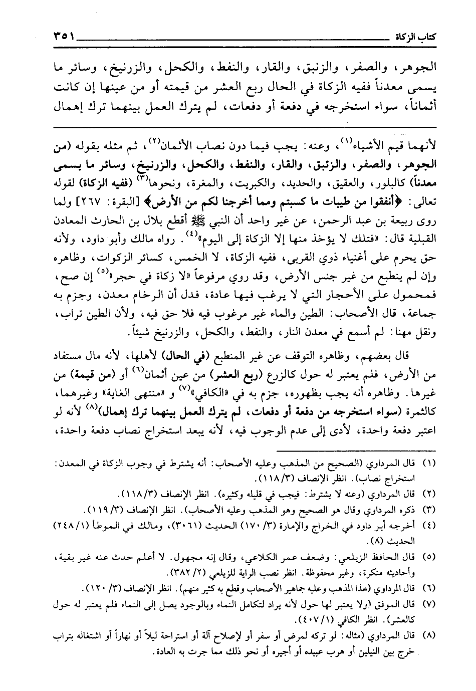 الْجَوْهَرِ وَالصُّفْرِ وَالزِّئْبَقِ وَالْقَارِ وَالنِّفْطِ وَالْكُحْلِ وَالزَّرْنِيخِ وَسَائِرِ مَا يُسَمَّى مَعْدِنًا، فَفِيهِ الزَّكَاةُ فِي الْحَالِ رُبْعُ الْعُشْرِ مِنْ قِيمَتِهِ، أَوْ مِنْ عَيْنِهَا إِنْ كَانَتْ أَثْمَانًا؛ سَوَاءٌ اسْتَخْرَجَهُ فِي دُفْعَةٍ أَوْ دُفُعَاتٍ، لَمْ يَتْرُكِ الْعَمَلَ بَيْنَهُمَا تَرْكَ إِهْمَالٍ،