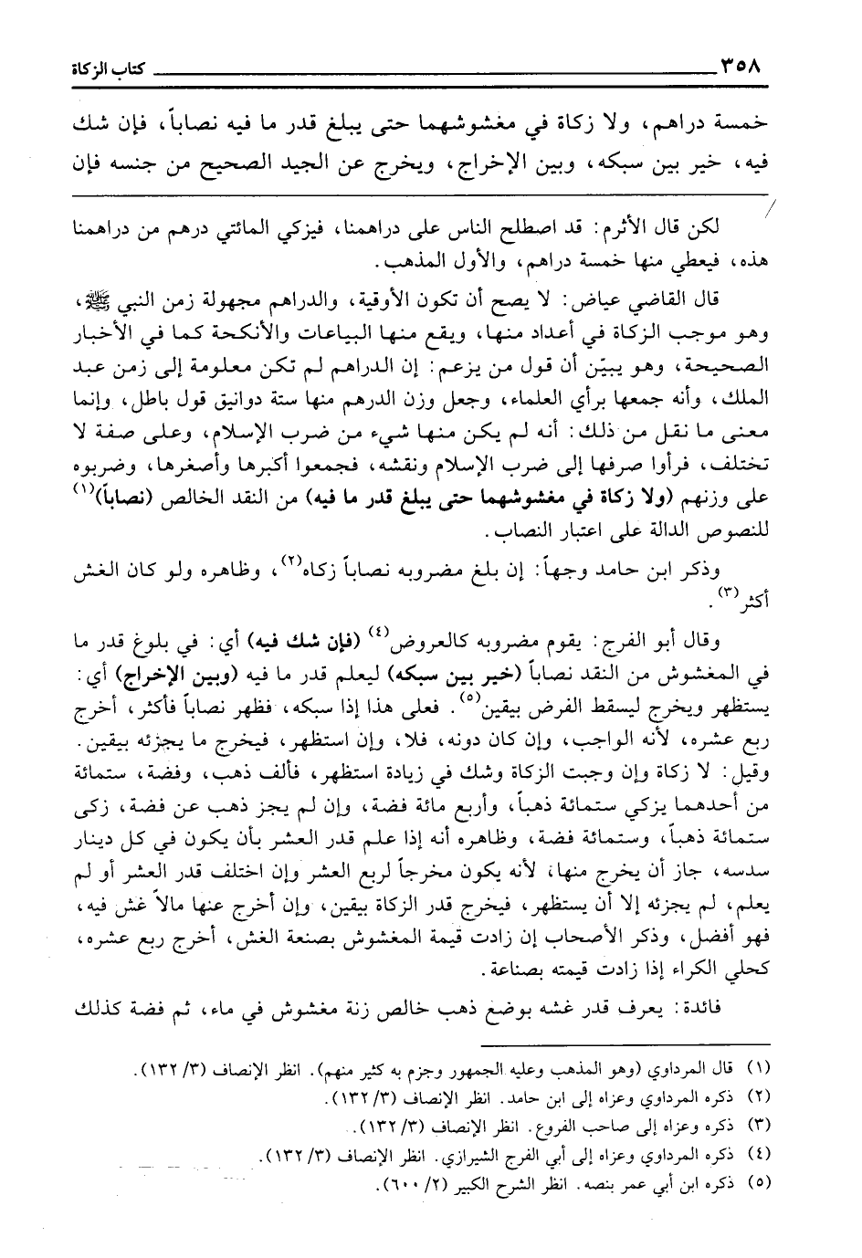 خَمْسَةُ دَرَاهِمَ، وَلَا زَكَاةَ فِي مَغْشُوشِهِمَا حَتَّى يَبْلُغَ قَدْرُ مَا فِيهِ نِصَابًا، فَإِنْ شَكَّ فِيهِ خُيِّرَ بَيْنَ سَبْكِهِ وَبَيْنَ الْإِخْرَاجِ، وَيُخْرِجُ عَنِ الْجَيِّدِ الصَّحِيحِ مِنْ جِنْسِهِ، فَإِنْ