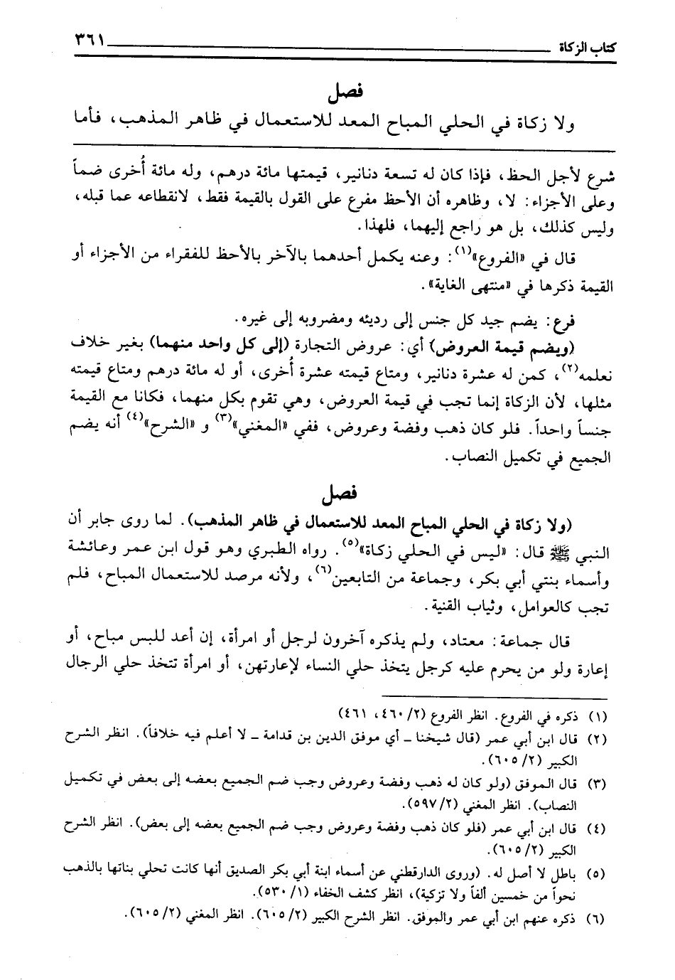 فَصْلٌ (وَلَا زَكَاةَ فِي الْحُلِيِّ الْمُبَاحِ الْمُعَدِّ لِلِاسْتِعْمَالِ فِي ظَاهِرِ الْمَذْهَبِ) لِمَا رَوَى جَابِرٌ أَنَّ النَّبِيَّ - صَلَّى اللَّهُ عَلَيْهِ وَسَلَّمَ - قَالَ: «لَيْسَ فِي الْحُلِيِّ زَكَاةٌ» رَوَاهُ الطَّبَرِيُّ؛ وَهُوَ قَوْلُ ابْنِ عُمَرَ وَعَائِشَةَ وَأَسْمَاءَ بِنْتَيْ أَبِي بَكْرٍ، وَجَمَاعَةٍ مِنَ التَّابِعِينَ، وَلِأَنَّهُ مُرْصَدٌ لِلِاسْتِعْمَالِ الْمُبَاحِ، فَلَمْ تَجِبْ كَالْعَوَامِلِ، وَثِيَابِ الْقِنْيَةِ، قَالَ جَمَاعَةٌ: مُعْتَادٌ، وَلَمْ يَذْكُرْهُ آخَرُونَ لِرَجُلٍ أَوِ امْرَأَةٍ إِنْ أُعِدَّ لِلُبْسٍ مُبَاحٍ أَوْ إِعَارَةٍ، وَلَوْ مَنْ يَحْرُمُ عَلَيْهِ كَرَجُلٍ يَتَّخِذُ حُلِيَّ النِّسَاءِ لِإِعَارَتِهِنَّ، أَوِ امْرَأَةٍ تَتَّخِذُ حُلِيَّ الرِّجَالِ