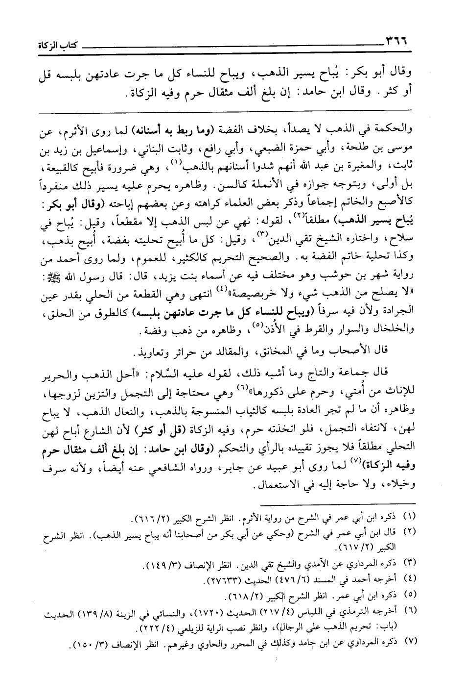 قَالَ جَمَاعَةٌ: وَالتَّاجُ، وَمَا أَشْبَهَ ذَلِكَ؛ لِقَوْلِهِ - عَلَيْهِ السَّلَامُ -: «أُحِلَّ الذَّهَبُ وَالْحَرِيرُ لِلْإِنَاثِ مِنْ أُمَّتِي، وَحُرِّمَ عَلَى ذُكُورِهَا» وَهِيَ مُحْتَاجَةٌ إِلَى التَّجَمُّلِ وَالتَّزَيُّنِ لِزَوْجِهَا، وَظَاهِرُهُ: أَنَّ مَا لَمْ تَجْرِ الْعَادَةُ بِلُبْسِهِ كَالثِّيَابِ الْمَنْسُوجَةِ بِالذَّهَبِ، وَالنِّعَالِ الذَّهَبِ، لَا يُبَاحُ لَهُنَّ لِانْتِفَاءِ التَّجَمُّلِ، فَلَوِ اتَّخَذَتْهُ حَرُمَ، وَفِيهِ الزَّكَاةُ (قَلَّ أَوْ كَثُرَ) ؛ لِأَنَّ الشَّارِعَ أَبَاحَ لَهُنَّ التَّحَلِّي مُطْلَقًا، فَلَا يَجُوزُ تَقْيِيدُهُ بِالرَّأْيِ وَالتَّحَكُّمِ (وَقَالَ ابْنُ حَامِدٍ: إِنْ بَلَغَ أَلْفَ مِثْقَالٍ حَرُمَ، وَفِيهِ الزَّكَاةُ) لِمَا رَوَى أَبُو عَبِيدٍ عَنْ جَابِرٍ، وَرَوَاهُ الشَّافِعِيُّ عَنْهُ أَيْضًا؛ وَلِأَنَّهُ سَرَفٌ وَخُيَلَاءُ، وَلَا حَاجَةَ إِلَيْهِ في الاستعمال.