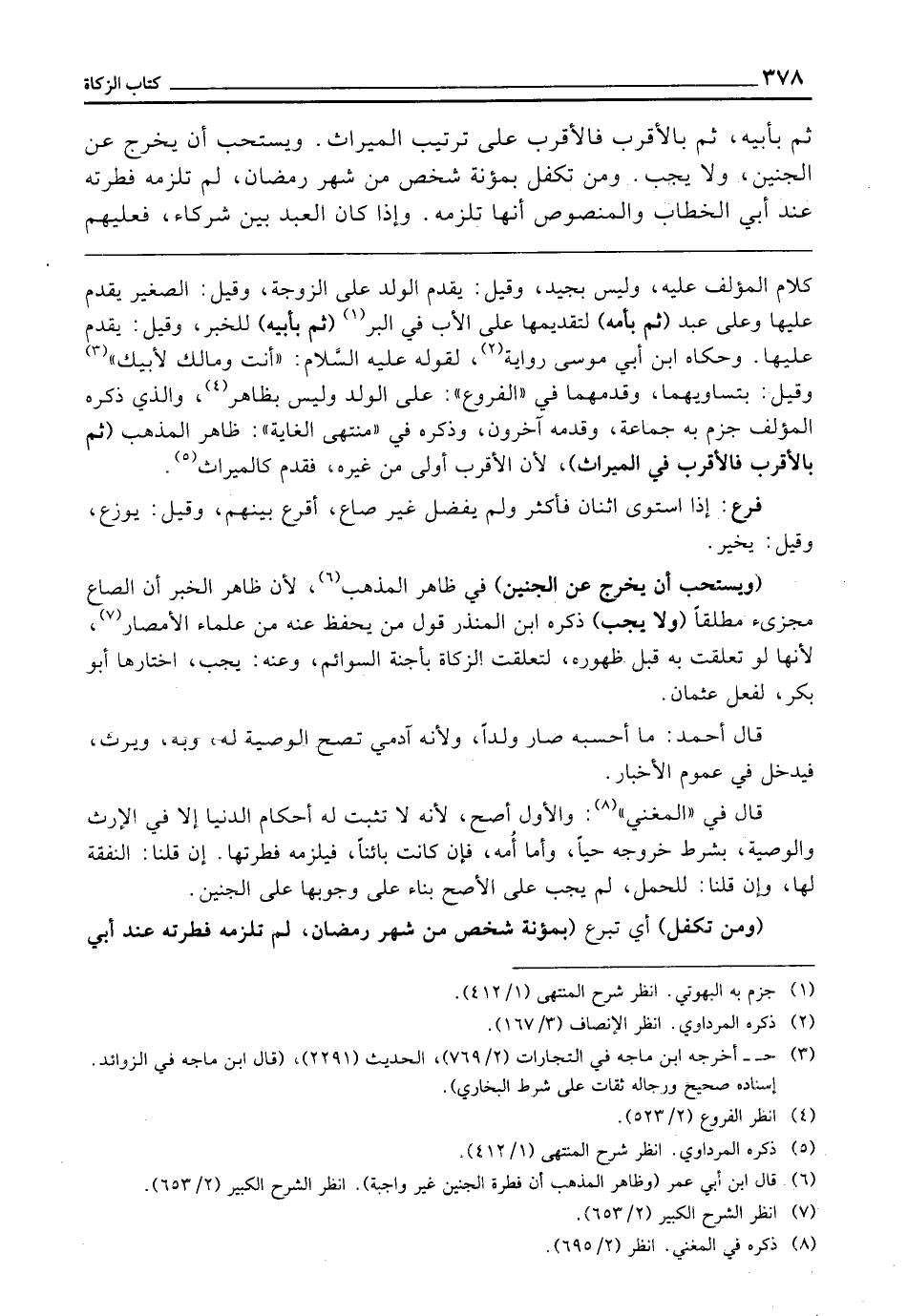 (وَيُسْتَحَبُّ أَنْ يُخْرِجَ عَنِ الْجَنِينِ) فِي ظَاهِرِ الْمَذْهَبِ؛ لِأَنَّ ظَاهِرَ الْخَبَرِ أَنَّ الصَّاعَ مُجْزِئٌ مُطْلَقًا (وَلَا يَجِبُ) ذَكَرَهُ ابْنُ الْمُنْذِرِ قَوْلُ مَنْ يَحْفَظُ عَنْهُ مِنْ عُلَمَاءِ الْأَمْصَارِ؛ لِأَنَّهَا لَوْ تَعَلَّقَتْ بِهِ قَبْلَ ظُهُورِهِ، لَتَعَلَّقَتِ الزَّكَاةُ بِأَجِنَّةِ السَّوَائِمِ، وَعَنْهُ: يَجِبُ، اخْتَارَهَا أَبُو بَكْرٍ لِفِعْلِ عُثْمَانَ.