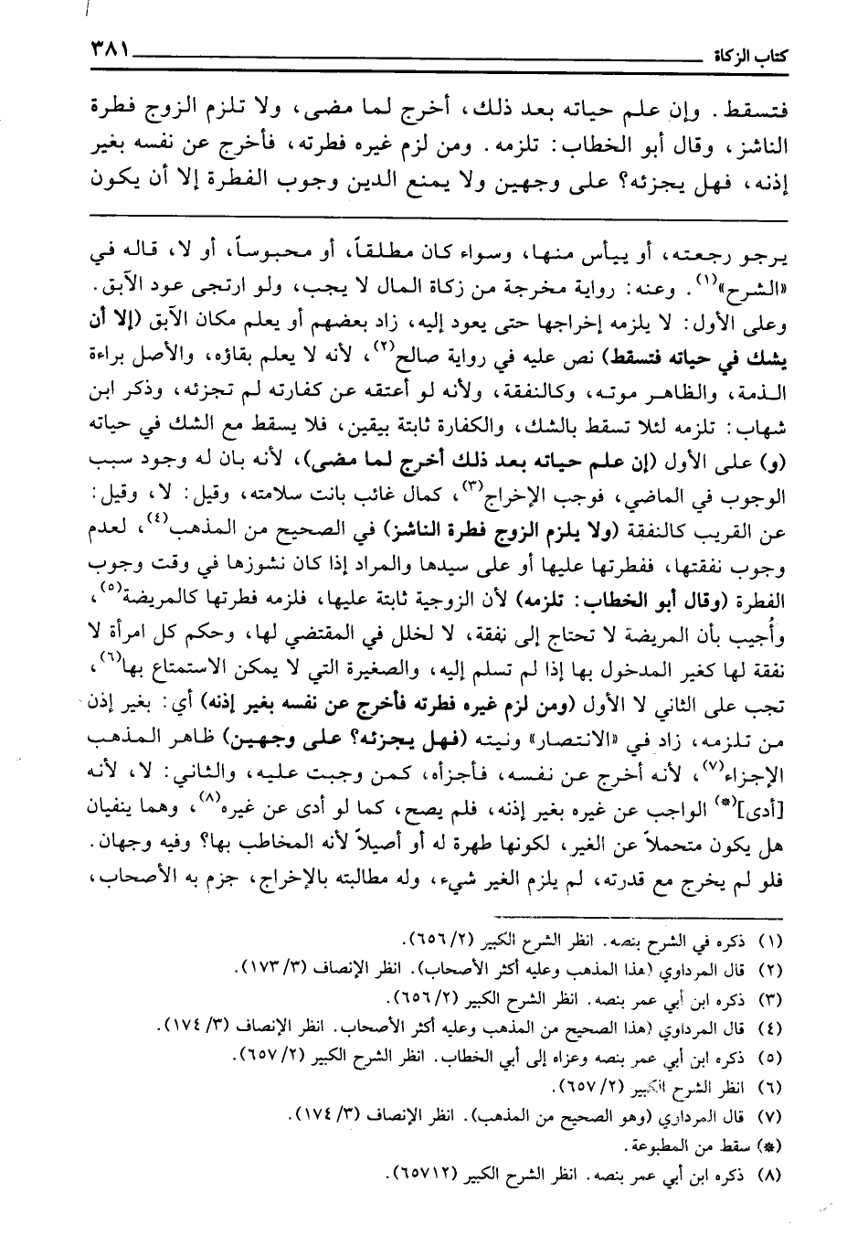 ـــــــــــــــــــــــــــــQيَرْجُوَ رَجَعَتْهُ أَوْ يَيْأَسَ مِنْهَا، وَسَوَاءٌ كَانَ مُطْلَقًا، أَوْ مَحْبُوسًا، أَوْ لَا، قَالَهُ فِي " الشَّرْحِ "، وَعَنْهُ: رِوَايَةٌ مُخَرَّجَةٌ مِنْ زَكَاةِ الْمَالِ لَا يَجِبُ، وَلَوِ ارْتَجَى عَوْدُ الْآبِقِ، وَعَلَى الْأَوَّلِ: لَا يَلْزَمُهُ إِخْرَاجُهَا حَتَّى يَعُودَ إِلَيْهِ، زَادَ بَعْضُهُمْ: أَوْ يَعْلَمَ مَكَانَ الْآبِقِ (إِلَّا أَنْ يَشُكَّ فِي حَيَاتِهِ فَتَسْقُطَ) نَصَّ عَلَيْهِ فِي رِوَايَةِ صَالِحٍ؛ لِأَنَّهُ لَا يُعْلَمُ بَقَاؤُهُ، وَالْأَصْلُ بَرَاءَةُ الذِّمَّةِ، وَالظَّاهِرُ مَوْتُهُ، وَكَالنَّفَقَةِ؛ وَلِأَنَّهُ لَوْ أَعْتَقَهُ عَنْ كَفَّارَتِهِ لَمْ تُجْزِئْهُ، وَذَكَرَ ابْنُ شِهَابٍ: تَلْزَمُهُ لِئَلَّا تَسْقُطَ بِالشَّكِّ، وَالْكَفَّارَةُ ثَابِتَةٌ بِيَقِينٍ، فَلَا يَسْقُطُ مَعَ الشَّكِّ فِي حَيَاتِهِ (وَ) عَلَى الْأَوَّلِ (إِنْ عَلِمَ حَيَاتَهُ بَعْدَ ذَلِكَ أَخْرَجَ لِمَا مَضَى) ؛ لِأَنَّهُ بَانَ لَهُ وُجُودُ سَبَبِ الْوُجُوبِ فِي الْمَاضِي، فَوَجَبَ الْإِخْرَاجُ، كَمَالِ غَائِبٍ بَانَتْ سَلَامَتُهُ، وَقِيلَ: لَا، وَقِيلَ: عَنِ الْقَرِيبِ كَالنَّفَقَةِ.