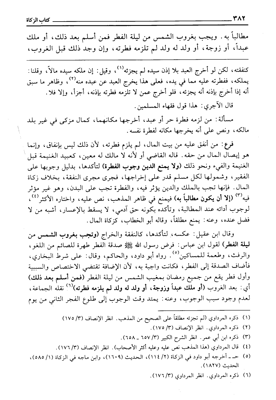 وَتَجِبُ بِغُرُوبِ الشَّمْسِ مِنْ لَيْلَةِ الْفِطْرِ، فَمَنْ أَسْلَمَ بَعْدَ ذَلِكَ أَوْ مَلَكَ عَبْدًا أَوْ زَوْجَةً أَوْ وُلِدَ لَهُ وَلَدٌ لَمْ تَلْزَمْهُ فِطْرَتُهُ، وَإِنْ وُجِدَ ذَلِكَ قَبْلَ الْغُرُوبِ