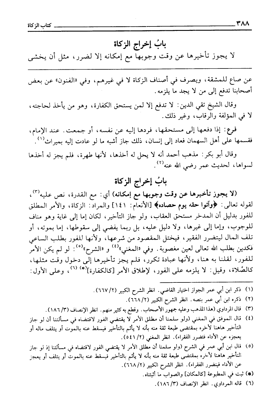 لَا يَجُوزُ تَأْخِيرُهَا عَنْ وَقْتِ وُجُوبِهَا مَعَ إِمْكَانِهِ، أَيْ: مَعَ الْقُدْرَةِ، نَصَّ عَلَيْهِ؛ لِقَوْلِهِ تَعَالَى: {وَآتُوا حَقَّهُ يَوْمَ حَصَادِهِ} [الأنعام: 141] وَالْمُرَادُ الزَّكَاةُ، وَالْأَمْرُ الْمُطْلَقُ لِلْفَوْرِ، بِدَلِيلِ أَنَّ الْمُدَّخِرَ مُسْتَحِقُّ الْعِقَابِ، وَلَوْ جَازَ التَّأْخِيرُ لَكَانَ إِمَّا إِلَى غَايَةٍ؛ وَهُوَ مُنَافٍ لِلْوُجُوبِ، وَإِمَّا إِلَى غَيْرِهَا، وَلَا دَلِيلَ عَلَيْهِ، بَلْ ربما يفضي إِلَى سُقُوطِهَا إِمَّا بِمَوْتِهِ أَوْ تَلَفِ الْمَالِ، لِيَتَضَرَّرَ الْفَقِيرُ، فَيَخْتَلُّ الْمَقْصُودُ مِنْ شَرْعِهَا؛ وَلِأَنَّهَا لِلْفَوْرِ بِطَلَبِ السَّاعِي، فَكَدَيْنٍ بِطَلَبِ اللَّهِ تَعَالَى لَعِينٍ مَغْصُوبَةٍ، وَفِي " الْمُغْنِي "، وَ " الشَّرْحِ " لَوْ لَمْ يَكُنِ الْأَمْرُ لِلْفَوْرِ لَقُلْنَا بِهِ هُنَا؛ وَلِأَنَّهَا عِبَادَةٌ تُكَرَّرُ، فَلَمْ يَجُزْ تَأْخِيرُهَا إِلَى دُخُولِ وَقْتِ مِثْلِهَا كَالصَّلَاةِ، وَقِيلَ: لَا يَلْزَمُهُ عَلَى الْفَوْرِ لِإِطْلَاقِ الْأَمْرِ كالكفارة، وَعَلَى الْأَوَّلِ: