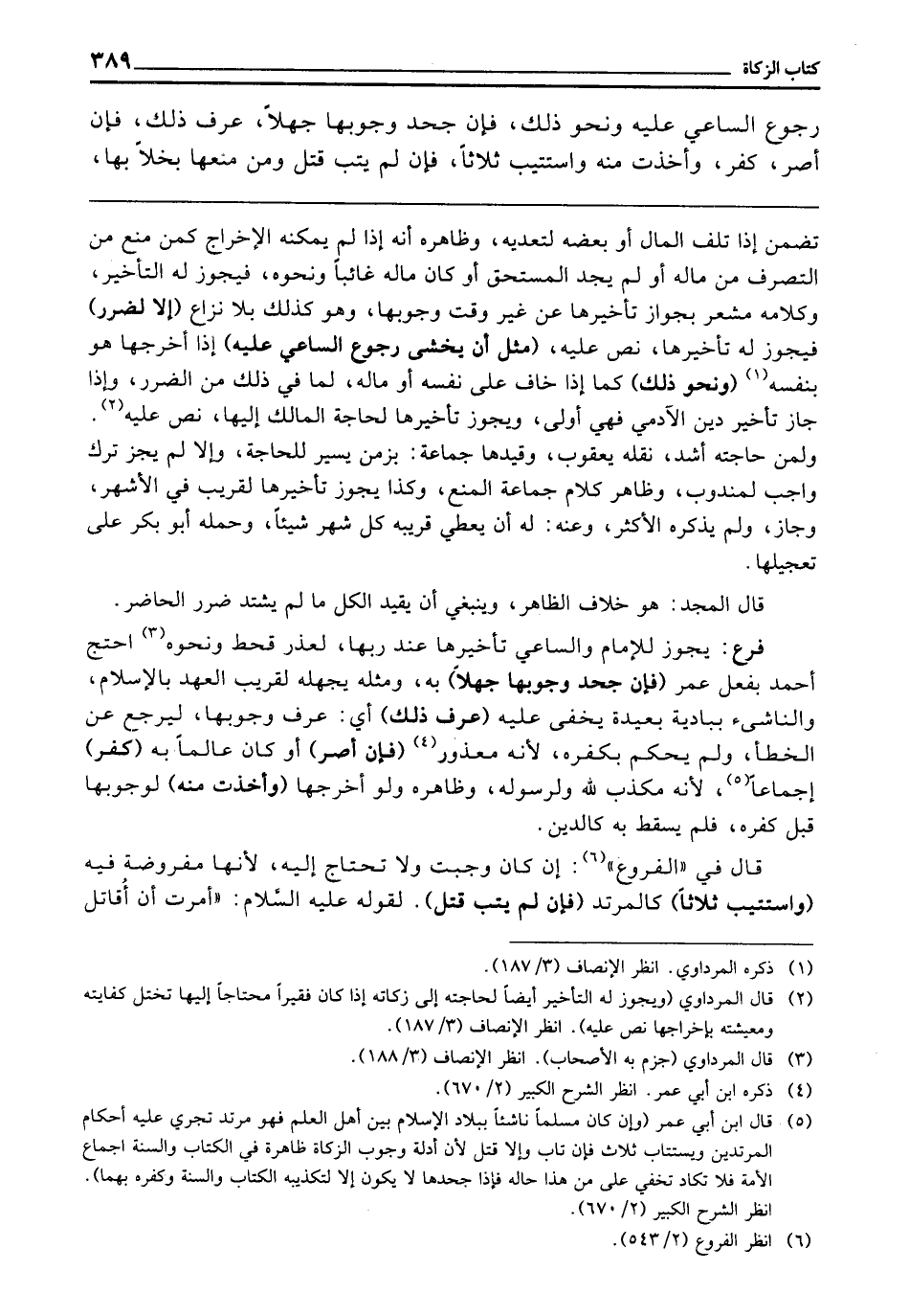 رُجُوعَ السَّاعِي عَلَيْهِ، وَنَحْوُ ذَلِكَ، فَإِنْ جَحَدَ وُجُوبَهَا جَهْلًا، عُرِّفَ ذَلِكَ، فَإِنْ أَصَرَّ كَفَرَ، وَأُخِذَتْ مِنْهُ، وَاسْتُتِيبَ ثَلَاثًا، فَإِنْ لَمْ يَتُبْ قُتِلَ، وَمَنْ مَنَعَهَا بُخْلًا بِهَا،