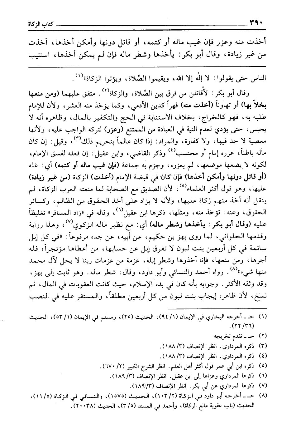 ، وَقَالَ أَبُو بَكْرٍ: لَأُقَاتِلَنَّ مَنْ فَرَّقَ بَيْنَ الصَّلَاةِ وَالزَّكَاةِ. مُتَّفَقٌ عَلَيْهِمَا، (وَمَنْ مَنَعَهَا بُخْلًا بِهَا) أَوْ تَهَاوُنًا (أُخِذَتْ مِنْهُ) قَهْرًا كَدَيْنِ الْآدَمِيِّ، وَكَمَا يُؤْخَذُ مِنْهُ الْعُشْرُ؛ وَلِأَنَّ لِلْإِمَامِ طَلَبَهُ بِهِ، فَهُوَ كَالْخَرَاجِ، بِخِلَافِ الِاسْتِنَابَةِ فِي الْحَجِّ، وَالتَّكْفِيرِ بِالْمَالِ، وَظَاهِرُهُ أَنَّهُ لَا يُحْبَسُ حَتَّى يُؤَدِّيَ لِعَدَمِ النِّيَّةِ فِي الْعِبَادَةِ مِنَ الْمُمْتَنِعِ، (وَعُزِّرَ) لِتَرْكِهِ الْوَاجِبَ عَلَيْهِ؛ وَلِأَنَّهَا مَعْصِيَةٌ لَا حَدَّ فِيهَا، وَلَا كَفَّارَةَ، وَالْمُرَادُ: إِذَا كَانَ عَالِمًا بِتَحْرِيمِ ذَلِكَ، وَقِيلَ: إِنْ كَانَ مَالُهُ بَاطِنًا عَزَّرَهُ إِمَامٌ أَوْ مُحْتَسِبٌ، وَذَكَرَ الْقَاضِي، وَابْنُ عَقِيلٍ: إِنْ فَعَلَهُ لِفِسْقِ الْإِمَامِ؛ لِكَوْنِهِ لَا يَضَعُهَا مَوْضِعَهَا، لَمْ يُعَزِّرْهُ، وَجَزَمَ بِهِ جَمَاعَةٌ، (فَإِنْ غَيَّبَ مَالَهُ أَوْ كَتَمَهُ) ، أَيْ: غَلَّهُ (أَوْ قَاتَلَ دُونَهَا، وَأَمْكَنَ أَخْذُهَا) فَإِنْ كَانَ فِي قَبْضَةِ الْإِمَامِ (أُخِذَتْ) الزَّكَاةُ (مِنْ غَيْرِ زِيَادَةٍ) عَلَيْهَا، وَهُوَ قَوْلُ أَكْثَرِ الْعُلَمَاءِ؛ لِأَنَّ الصِّدِّيقَ مَعَ الصَّحَابَةِ لَمَّا مَنَعَتْهُ الْعَرَبُ الزَّكَاةَ، لَمْ يُنْقَلْ أَنَّهُ أَخَذَ مِنْهُمْ زَكَاةً عَلَيْهَا، وَلِأَنَّهُ لَا يُزَادُ عَلَى أَخْذِ الْحُقُوقِ مِنَ الظَّالِمِ، وَكَسَائِرِ الْحُقُوقِ، وَعَنْهُ: تُؤْخَذُ مِنْهُ، وَمِثْلُهَا، ذَكَرَهَا ابْنُ عَقِيلٍ، وَقَالَهُ فِي " زَادِ الْمُسَافِرِ " تَغْلِيظًا عَلَيْهِ (وَقَالَ أَبُو بَكْرٍ: يَأْخُذُهَا، وَشَطْرَ مَالِهِ) أَيْ: مَعَ نَظِيرِ مَالِهِ الزَّكَوِيِّ، وَهَذَا رِوَايَةٌ، وَقَدَّمَهَا الْحُلْوَانِيُّ، لِمَا رَوَى بَهْزُ بْنُ حَكِيمٍ عَنْ أَبِيهِ عَنْ جَدِّهِ مَرْفُوعًا: «فِي كُلِّ إِبِلٍ سَائِمَةٍ فِي كُلِّ أَرْبَعِينَ بِنْتُ لَبُونٍ، لَا تُفَرَّقُ إِبِلٌ عَنْ حِسَابِهَا، مَنْ أَعْطَاهَا مُؤْتَجِرًا فَلَهُ أَجْرُهَا، وَمَنْ مَنَعَهَا، فَإِنَّا آخِذُوهَا وَشَطْرَ إِبِلِهِ، عَزْمَةً مِنْ عَزَمَاتِ رَبِّنَا، لَا يَحِلُّ لِآلِ مُحَمَّدٍ مِنْهَا شَيْءٌ» رَوَاهُ أَحْمَدُ، وَالنَّسَائِيُّ، وَأَبُو دَاوُدَ. وَقَالَ: شَطْرَ مَالِهِ؛ وَهُوَ ثَابِتٌ إِلَى بَهْزٍ، وَقَدْ وَثَّقَهُ الْأَكْثَرُ، وَجَوَابُهُ بِأَنَّهُ كَانَ فِي بَدْءِ الْإِسْلَامِ، حَيْثُ كَانَتِ الْعُقُوبَاتُ فِي الْمَالِ، ثُمَّ نُسِخَ؛ لِأَنَّ ظَاهِرَهُ إِيجَابُ بِنْتِ لَبُونٍ مِنْ كُلِّ أَرْبَعِينَ مُطْلَقًا، وَالْمُسْتَقَرُّ عَلَيْهِ فِي النُّصُبِ