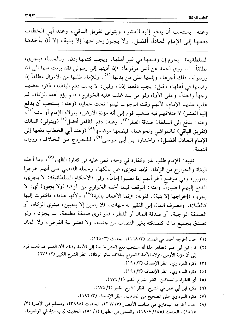 ـــــــــــــــــــــــــــــQالسُّلْطَانِيَّةِ " يَحْرُمُ إِنْ وَضَعَهَا فِي غَيْرِ أَهْلِهَا، وَيَجِبُ كَتْمُهَا إِذَنْ، وَبِالْجُمْلَةِ فَيُجْزِئُ مُطْلَقًا؛ لِمَا رَوَى أَحْمَدُ عَنْ أَنَسٍ مَرْفُوعًا: «إِذَا أَدَّيْتَهَا إِلَى رَسُولِي، فَقَدْ بَرِئْتَ مِنْهَا إِلَى اللَّهِ وَرَسُولِهِ، فَلَكَ أَجْرُهَا، وَإِثْمُهَا عَلَى مَنْ بَدَّلَهَا» وَلِلْإِمَامِ طَلَبُهَا مِنَ الْأَمْوَالِ مُطْلَقًا إِذَا وَضَعَهَا فِي أَهْلِهَا، وَقِيلَ: يَجِبُ دَفْعُهَا إِذَنْ، وَقِيلَ: لَا يَجِبُ دَفْعُ الْبَاطِنَةِ، ذَكَرَهُ بَعْضُهُمْ وَجْهًا وَاحِدًا، وَعَلَى الْأَوَّلِ: وَلَوْ مِنْ بَلَدٍ غَلَبَ عَلَيْهِ الْخَوَارِجُ، فَلَمْ يُؤَدِّ أَهْلُهُ الزَّكَاةَ، ثُمَّ غَلَبَ عَلَيْهِمُ الْإِمَامُ؛ لِأَنَّهُمْ وَقْتَ الْوُجُوبِ لَيْسُوا تَحْتَ حِمَايَتِهِ (وَعَنْهُ: يُسْتَحَبُّ أَنْ يَدْفَعَ إِلَيْهِ الْعُشْرَ) لِاخْتِلَافِهِمْ فِيهِ، فَذَهَبَ قَوْمٌ إِلَى أَنَّهُ مُؤْنَةُ الْأَرْضِ، يَتَوَلَّاهُ الْإِمَامُ أَوْ نَائِبُهُ، وَعَنْهُ: يَدْفَعُ إِلَى السُّلْطَانِ صَدَقَةَ الْفِطْرِ، وَعَنْهُ: دَفْعُ الظَّاهِرِ أَفْضَلُ (وَيَتَوَلَّى) الْمَالِكُ (تَفْرِيقَ الْبَاقِي) كَالْمَوَاشِي وَنَحْوِهِمَا، فَيَضَعُهَا مَوْضِعَهَا (وَعِنْدَ أَبِي الْخَطَّابِ دَفْعُهَا إِلَى الْإِمَامِ الْعَادِلِ أَفْضَلُ) وَاخْتَارَهُ ابْنُ أَبِي مُوسَى لِلْخُرُوجِ مِنَ الْخِلَافِ، وَزَوَالِ التُّهْمَةِ.