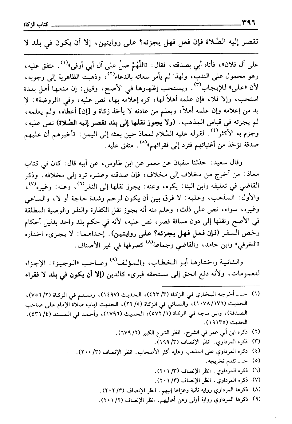 وَقَالَ سَعِيدٌ: حَدَّثَنَا سُفْيَانُ عَنْ مَعْمَرٍ عَنِ ابْنِ طَاوُسٍ عَنْ أَبِيهِ قَالَ: كَانَ فِي كِتَابِ مُعَاذٍ: «مَنْ أَخْرَجَ مِنْ مِخْلَافٍ إِلَى مِخْلَافٍ، فَإِنَّ صَدَقَتَهُ وَعُشْرَهُ تُرَدُّ إِلَى مِخْلَافِهِ» وَذَكَرَ الْقَاضِي فِي تَعْلِيقِهِ وَابْنُ الْبَنَّا: يُكْرَهُ، وَعَنْهُ: يَجُوزُ نَقْلُهَا إِلَى الثَّغْرِ، وَعَنْهُ: وَغَيْرِهِ، وَالْأَوَّلُ: الْمَذْهَبُ، وَعَلَيْهِ: لَا فَرْقَ بَيْنَ أَنْ يَكُونَ لِرَحِمٍ وَشِدَّةِ حَاجَةٍ أَوْ لَا. وَالسَّاعِي وَغَيْرُهُ سَوَاءٌ، نَصَّ عَلَى ذَلِكَ، وَعُلِمَ مِنْهُ أَنَّهُ يَجُوزُ نَقْلُ الْكَفَّارَةِ وَالنَّذْرِ وَالْوَصِيَّةِ الْمُطْلَقَةِ فِي الْأَصَحِّ، وَنَقْلُهَا إِلَى دُونِ مَسَافَةِ قَصْرٍ، نَصَّ عَلَيْهِ؛ لِأَنَّهُ فِي حُكْمِ بَلَدٍ وَاحِدٍ، بِدَلِيلِ أَحْكَامِ رُخَصِ السَّفَرِ (فَإِنْ فَعَلَ فَهَلْ يُجْزِئُهُ؟ عَلَى رِوَايَتَيْنِ) إِحْدَاهُمَا: لَا يُجْزِئُ، اخْتَارَهُ الْخِرَقِيُّ، وَابْنُ حَامِدٍ، وَالْقَاضِي، وَجَمَاعَةٌ، كَصَرْفِهَا فِي غَيْرِ الْأَصْنَافِ.