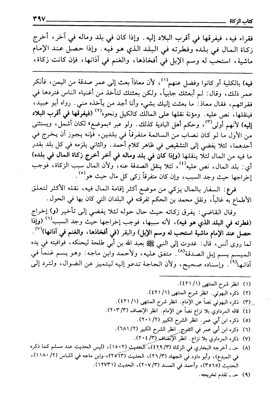 ـــــــــــــــــــــــــــــQفِيهِ) بِالْكُلِّيَّةِ، أَوْ كَانُوا وَفَضَلَ عَنْهُمْ؛ لِأَنَّ مُعَاذًا بَعَثَ إِلَى عُمَرَ صَدَقَةً مِنَ الْيَمَنِ، فَأَنْكَرَ عُمَرُ ذَلِكَ، وَقَالَ: لَمْ أَبْعَثْكَ جَابِيًا، وَلَكِنْ بَعَثْتُكَ لِتَأْخُذَ مِنْ أَغْنِيَاءِ النَّاسِ فَتَرُدَّهَا فِي فُقَرَائِهِمْ، فَقَالَ مُعَاذٌ: مَا بَعَثْتُ إِلَيْكَ بِشَيْءٍ وَأَنَا أَجِدُ مَنْ يَأْخُذُهُ مِنِّي. رَوَاهُ أَبُو عُبَيْدٍ، فَيَنْقُلُهَا، نَصَّ عَلَيْهِ، وَمُؤْنَةُ نَقْلِهَا عَلَى الْمَالِكِ كَالْكَيْلِ وَنَحْوِهِ (فَيُفَرِّقُهَا فِي أَقْرَبِ الْبِلَادِ إِلَيْهِ) ؛ لِأَنَّهُمْ أَوْلَى، وَحُكْمُ أَهْلِ الْبَادِيَةِ كَذَلِكَ، وَلَوْ عَبَّرَ " بِمَوْضِعٍ " لَكَانَ أَشْمَلَ، وَيُسْتَثْنَى مِنَ الْأَوَّلِ مَا لَوْ كَانَ نِصَابٌ مِنَ السَّائِمَةِ مُتَفَرِّقًا فِي بَلَدَيْنِ، فَإِنَّهُ يَجُوزُ أَنْ يُخْرَجَ فِي أَحَدِهِمَا؛ لِئَلَّا يُفْضِيَ إِلَى التَّشْقِيصِ فِي ظَاهِرِ كَلَامِ أَحْمَدَ، وَالثَّانِي: يَلْزَمُهُ فِي كُلِّ بَلَدٍ بِقَدْرِ مَا فِيهِ مِنَ الْمَالِ؛ لِئَلَّا يَنْقُلَهَا (وَإِذَا كَانَ فِي بَلَدٍ، وَمَالُهُ فِي آخَرَ، أَخْرَجَ زَكَاةَ الْمَالِ فِي بَلَدِهِ) أَيْ: بَلَدِ الْمَالِ، نَصَّ عَلَيْهِ؛ لِئَلَّا يَنْقُلَ الصَّدَقَةَ عَنْهُ، وَلِأَنَّ الْمَالَ سَبَبُ الزَّكَاةِ، فَوَجَبَ إِخْرَاجُهَا حَيْثُ وُجِدَ السَّبَبُ، وَإِنْ كَانَ مُتَفَرِّقًا زَكَّى كُلَّ مَالٍ حَيْثُ هُوَ.