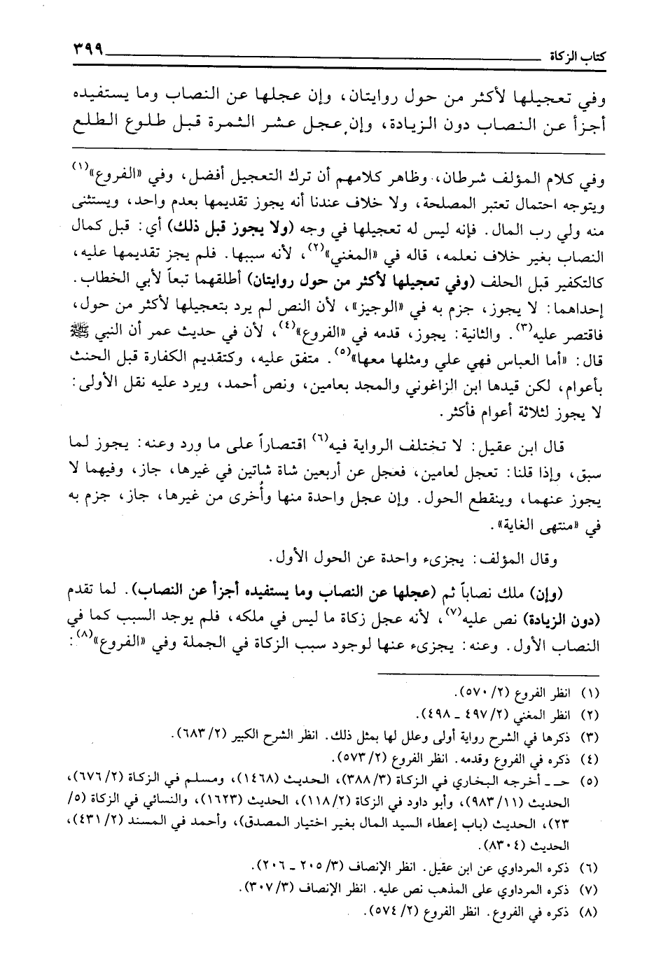 ـــــــــــــــــــــــــــــQوَفِي كَلَامِ الْمُؤَلِّفِ شَرْطَانِ، وَظَاهِرُ كَلَامِهِمْ أَنَّ تَرْكَ التَّعْجِيلِ أَفْضَلُ، وَفِي " الْفُرُوعِ "، وَيَتَوَجَّهُ احْتِمَالٌ: تُعْتَبَرُ الْمَصْلَحَةُ، وَلَا خِلَافَ عِنْدِنَا أَنَّهُ يَجُوزُ تَقْدِيمُهَا بِعَامٍ وَاحِدٍ، وَيُسْتَثْنَى مِنْهُ وَلِيُّ رَبِّ الْمَالِ، فَإِنَّهُ لَيْسَ لَهُ تَعْجِيلُهَا فِي وَجْهٍ، (وَلَا يَجُوزُ قَبْلَ ذَلِكَ) ، أَيْ: قَبْلَ كَمَالِ النِّصَابِ بِغَيْرِ خِلَافٍ نَعْلَمُهُ، قَالَهُ فِي " الْمُغْنِي "؛ لِأَنَّهُ سَبَبُهَا، فَلَمْ يَجُزْ تَقْدِيمُهَا عَلَيْهِ، كَالتَّكْفِيرِ قَبْلَ الْحَلِفِ، (وَفِي تَعْجِيلِهَا لِأَكْثَرَ مِنْ حَوْلٍ رِوَايَتَانِ) أَطْلَقَهُمَا تَبَعًا لِأَبِي الْخَطَّابِ، إِحْدَاهُمَا: لَا يَجُوزُ، جَزَمَ بِهِ فِي " الْوَجِيزِ "؛ لِأَنَّ النَّصَّ لَمْ يَرِدْ بِتَعْجِيلِهَا لِأَكْثَرَ مِنْ حَوْلٍ، فَاقْتَصَرَ عَلَيْهِ، وَالثَّانِيَةُ: يَجُوزُ، قَدَّمَهُ فِي " الْفُرُوعِ "؛ لِأَنَّ فِي حَدِيثِ عُمَرَ أَنَّ النَّبِيَّ - صَلَّى اللَّهُ عَلَيْهِ وَسَلَّمَ - قَالَ: «أَمَّا الْعَبَّاسُ، فَهِيَ عَلَيَّ، وَمِثْلُهَا مَعَهَا» مُتَّفَقٌ عَلَيْهِ، وَكَتَقْدِيمِ الْكَفَّارَةِ قَبْلَ الْحِنْثِ بِأَعْوَامٍ، لَكِنْ قَيَّدَهَا ابْنُ الزَّاغُونِيِّ وَالْمَجْدُ بِعَامَيْنِ، وَنَصُّ أَحْمَدَ، وَيَرِدُ عَلَيْهِ نَقْلُ الْأُولَى: لَا يَجُوزُ لِثَلَاثَةِ أَعْوَامٍ فَأَكْثَرَ.