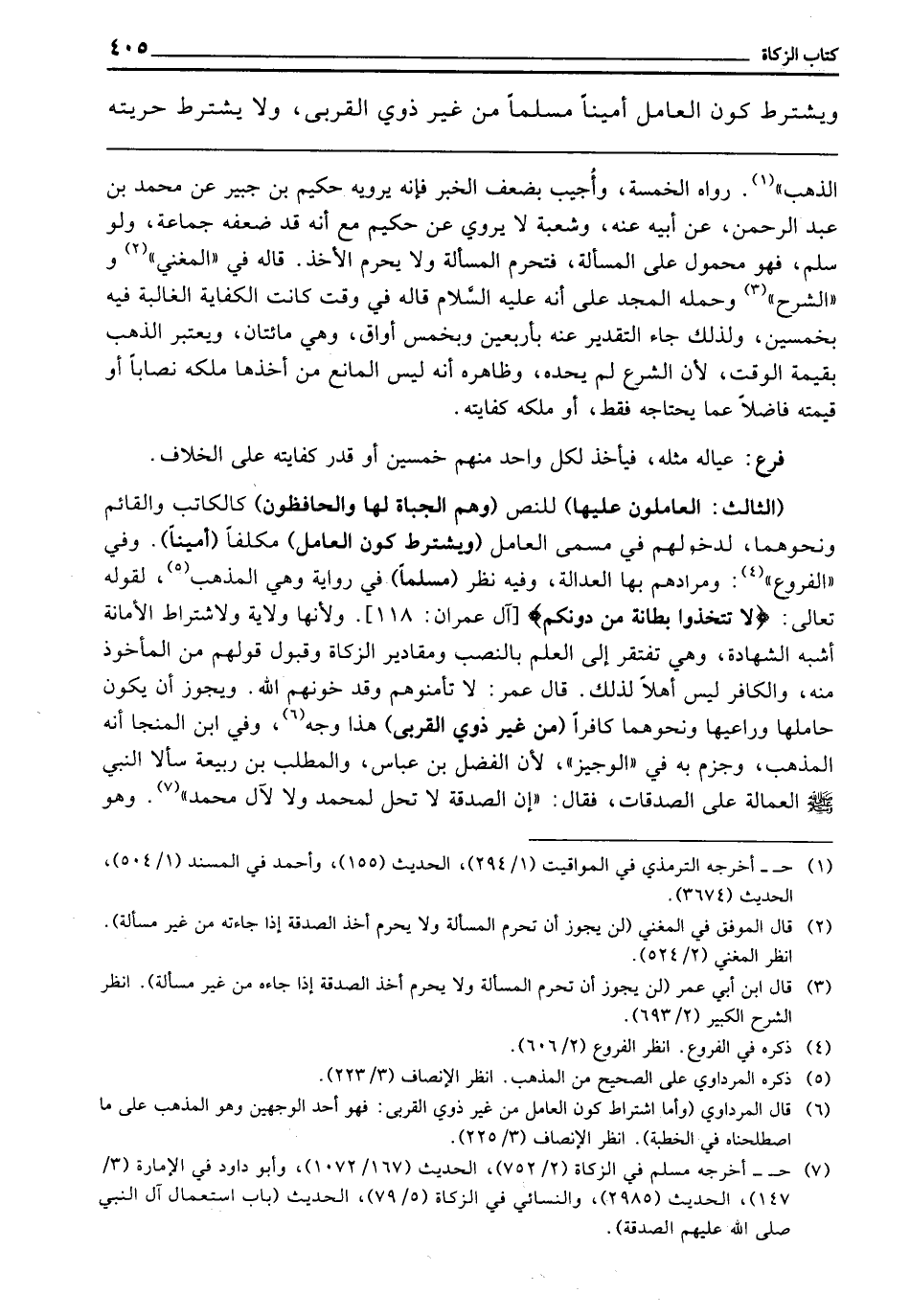 (الثَّالِثُ: الْعَامِلُونَ عَلَيْهَا) لِلنَّصِّ (وَهُمُ الْجُبَاةُ لَهَا، وَالْحَافِظُونَ) كَالْكَاتِبِ وَالْقَائِمِ وَنَحْوِهِمَا لِدُخُولِهِمْ فِي مُسَمَّى الْعَامِلِ (وَيُشْتَرَطُ كَوْنُ الْعَامِلِ) مُكَلَّفًا (أَمِينًا) وَفِي " الْفُرُوعِ " وَمُرَادُهُمْ بِهَا الْعَدَالَةُ، وَفِيهِ نَظَرٌ، (مُسْلِمًا) فِي رِوَايَةٍ؛ وَهِيَ الْمَذْهَبُ؛ لِقَوْلِهِ تَعَالَى: {لا تَتَّخِذُوا بِطَانَةً مِنْ دُونِكُمْ} [آل عمران: 118] لِأَنَّهَا وِلَايَةٌ؛ وَلِاشْتِرَاطِ الْأَمَانَةِ أَشْبَهَ الشَّهَادَةَ؛ وَهِيَ تَفْتَقِرُ إِلَى الْعِلْمِ بالنصب وَمَقَادِيرِ الزَّكَاةِ وَقَبُولِ قَوْلِهِمْ مِنَ الْمَأْخُوذِ مِنْهُ، وَالْكَافِرُ لَيْسَ أَهْلًا لِذَلِكَ، قَالَ عُمَرُ: لَا تَأْمَنُوهُمْ، وَقَدْ خَوَّنَهُمُ اللَّهُ، وَيَجُوزُ أَنْ يَكُونَ حَامِلُهَا وَرَاعِيهَا وَنَحْوُهُمَا كَافِرًا (مِنْ غَيْرِ ذَوِي الْقُرْبَى) هَذَا وَجْهٌ، وَفِي ابْنِ الْمُنَجَّا أَنَّهُ الْمَذْهَبُ، وَجَزَمَ بِهِ فِي " الْوَجِيزِ "؛ «لِأَنَّ الْفَضْلَ بْنَ عَبَّاسٍ، وَالْمُطَّلِبَ بْنَ رَبِيعَةَ سَأَلَا النَّبِيَّ - صَلَّى اللَّهُ عَلَيْهِ وَسَلَّمَ - الْعُمَالَةَ عَلَى الصَّدَقَاتِ فَقَالَ: إِنَّ الصَّدَقَةَ لَا تَحِلُّ لِمُحَمَّدٍ، وَلَا لِآلِ مُحَمَّدٍ» وَهُوَ