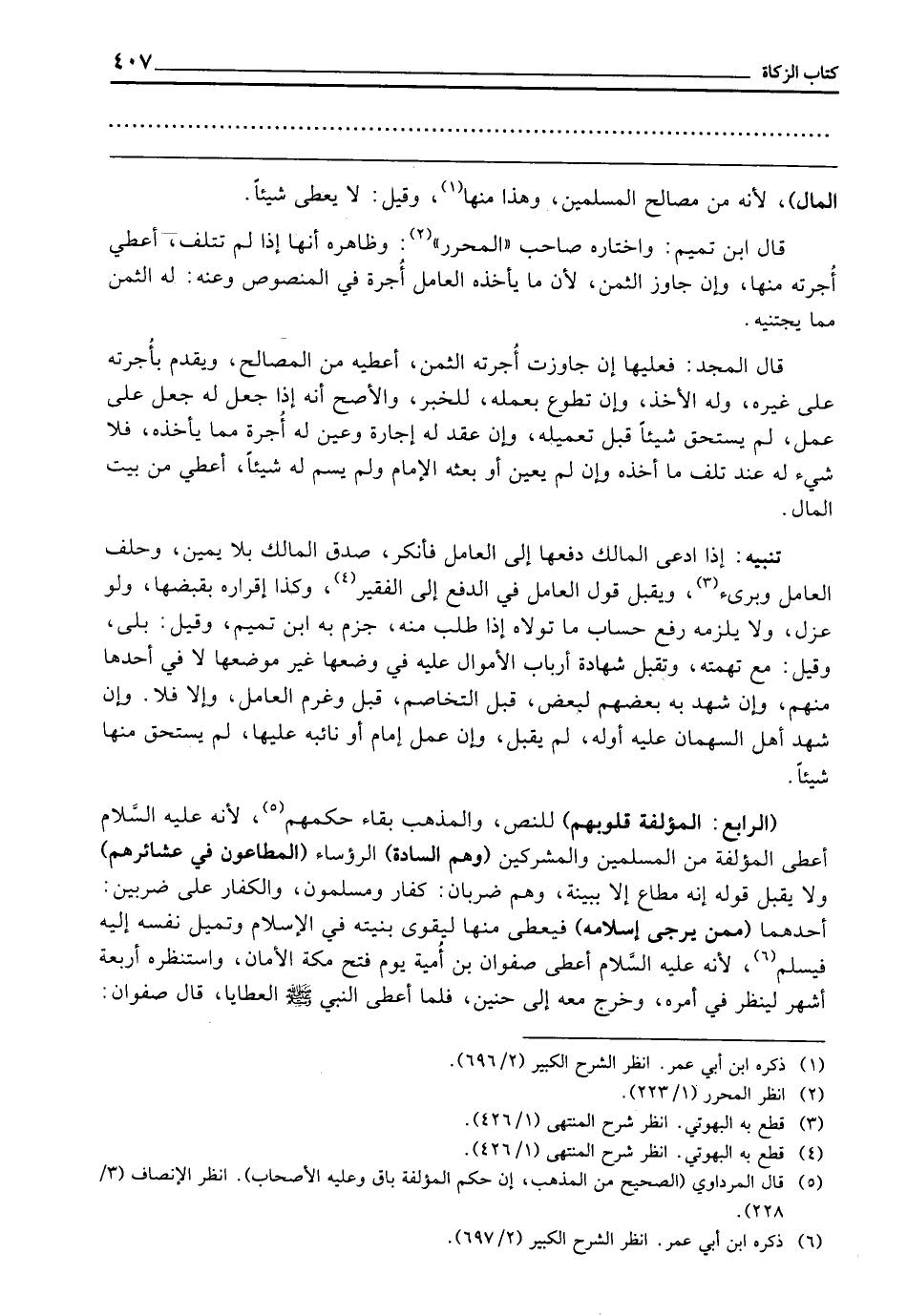 (الرَّابِعُ: الْمُؤَلَّفَةُ قُلُوبُهُمْ) لِلنَّصِّ، وَالْمَذْهَبُ بَقَاءُ حُكْمِهِمْ؛ لِأَنَّهُ - عَلَيْهِ السَّلَامُ - أَعْطَى الْمُؤَلِّفَةَ مِنَ الْمُسْلِمِينَ وَالْمُشْرِكِينَ (وَهُمُ السَّادَةُ) الرُّؤَسَاءُ (الْمُطَاعُونَ فِي عَشَائِرِهِمْ) وَلَا يُقْبَلُ قَوْلُهُ: إِنَّهُ مُطَاعٌ، إِلَّا بِبَيِّنَةٍ، وَهُمْ ضَرْبَانِ: كُفَّارُ وَمُسْلِمُونَ، وَالْكُفَّارُ عَلَى ضَرْبَيْنِ: أَحَدُهُمَا (مِمَّنْ يُرْجَى إِسْلَامُهُ) فَيُعْطَى مِنْهَا لِيَقْوَى بِنِيَّتِهِ فِي الْإِسْلَامِ وَتَمِيلَ نَفْسُهُ إِلَيْهِ فَيُسْلِمَ؛ لِأَنَّهُ - عَلَيْهِ السَّلَامُ - أَعْطَى صَفْوَانَ بْنَ أُمَيَّةَ يَوْمَ فَتْحِ مَكَّةَ الْأَمَانَ، وَاسْتَنْظَرَهُ أَرْبَعَةَ أَشْهُرٍ لِيَنْظُرَ فِي أَمْرِهِ، وَخَرَجَ مَعَهُ إِلَى حُنَيْنٍ، فَلَمَّا أَعْطَى النَّبِيُّ - صَلَّى اللَّهُ عَلَيْهِ وَسَلَّمَ - الْعَطَايَا، قَالَ صَفْوَانُ: