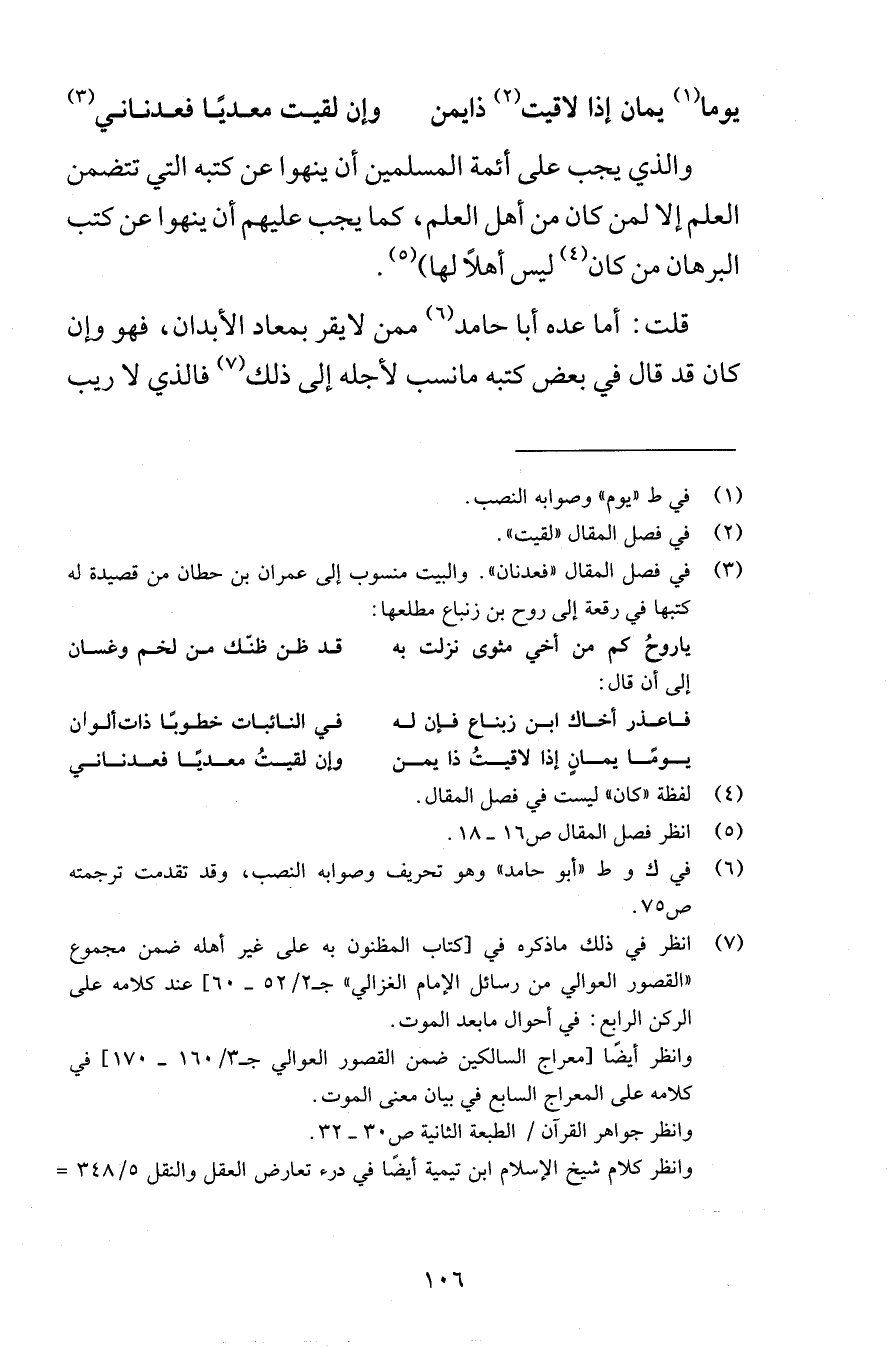 يوما يمان إذا لاقيت ذايمن وإن لقيت معديًا فعدناني والذي يجب على أئمة المسلمين أن ينهوا عن كتبه التي تتضمن العلم إلا لمن كان من أهل العلم كما يجب عليهم أن ينهوا عن كتب البرهان من كان ليس أهلاً لها قلت أما عده أبا حامد ممن لايقر بمعاد الأبدان فهو وإن كان قد قال في بعض كتبه مانسب لأجله إلى ذلك فالذي لا ريب