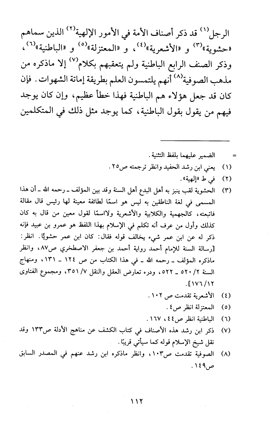 الرجل قد ذكر أصنا فالأمة في الأمور الإلهية الذين سماهم حشوية والأشعرية والمعتزلة والباطنية وذكر الصنف الرابع الباطنية ولم يتعقبهم بكلام إلا ماذكره من مذهب الصوفية أنهم يلتمسون العلم بطريقة إماتة الشهوات فإن كان قد جعل هؤلاء هم الباطنية فهذا خطأ عظيم وإن كان يوجد فيهم من يقول بقول الباطنية كما يوجد مثل ذلك في المتكلمين