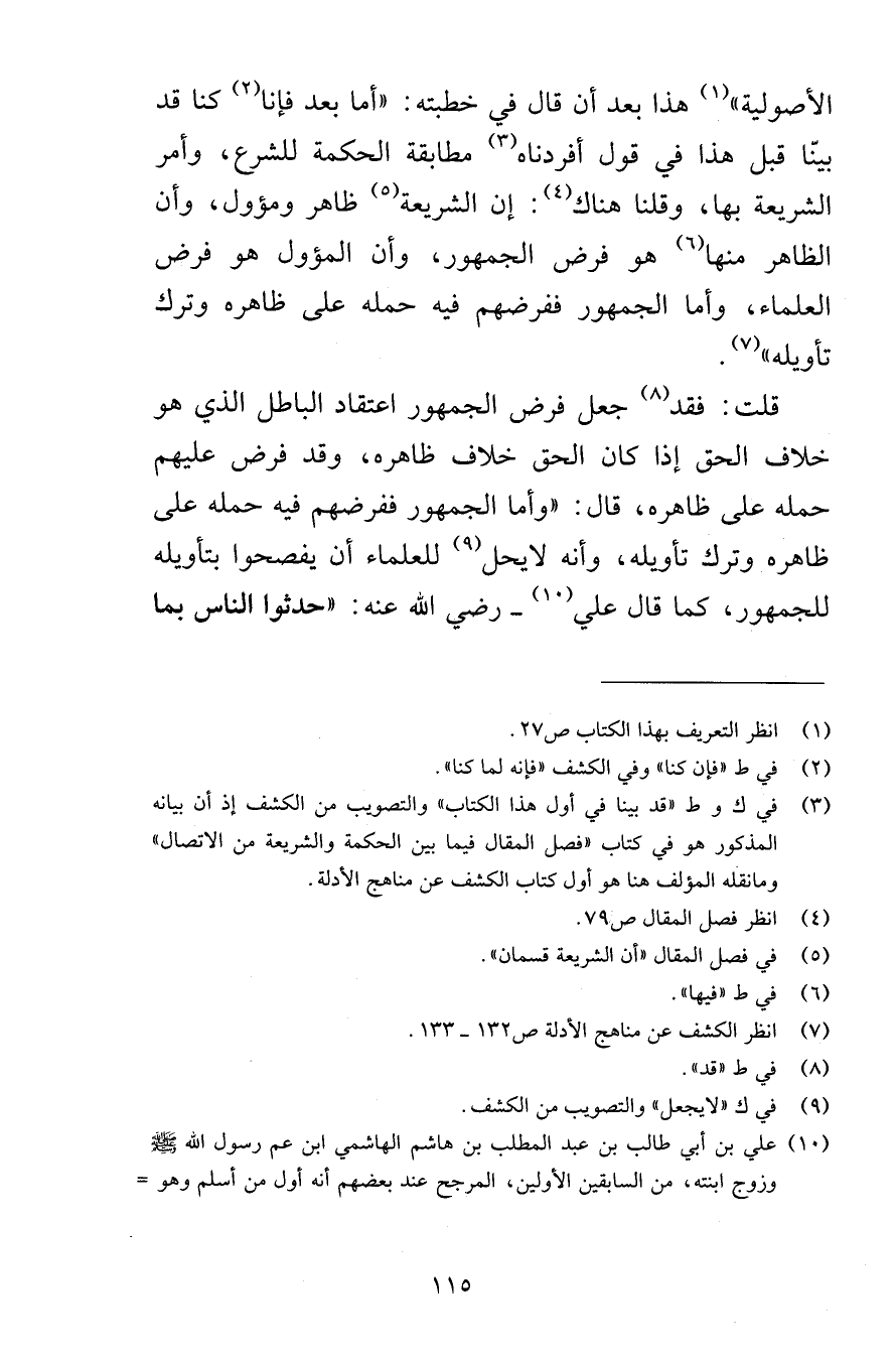 الأصولية هذا بعد أن قال في خطبته أما بعد فإنا كنا قد بينّا قبل هذا في قول أفردناه مطابقة الحكمة للشرع وأمر الشريعة بها وقلنا هناك إن الشريعة ظاهر ومؤول وأن الظاهر منها هو فرض الجمهور وأن المؤول هو فرض العلماء وأما الجمهور ففرضهم فيه حمله على ظاهره وترك تأويله قلت فقد جعل فرض الجمهور اعتقاد الباطل الذي هو خلاف الحق إذا كان الحق خلاف ظاهره وقد فرض عليهم حمله على ظاهره قال وأما الجمهور ففرضهم فيه حمله على ظاهره وترك تأويله وأنه لايحل للعلماء أن يفحصوا بتأويله للجمهور كما قال علي رضي الله عنه حدثوا الناس بما