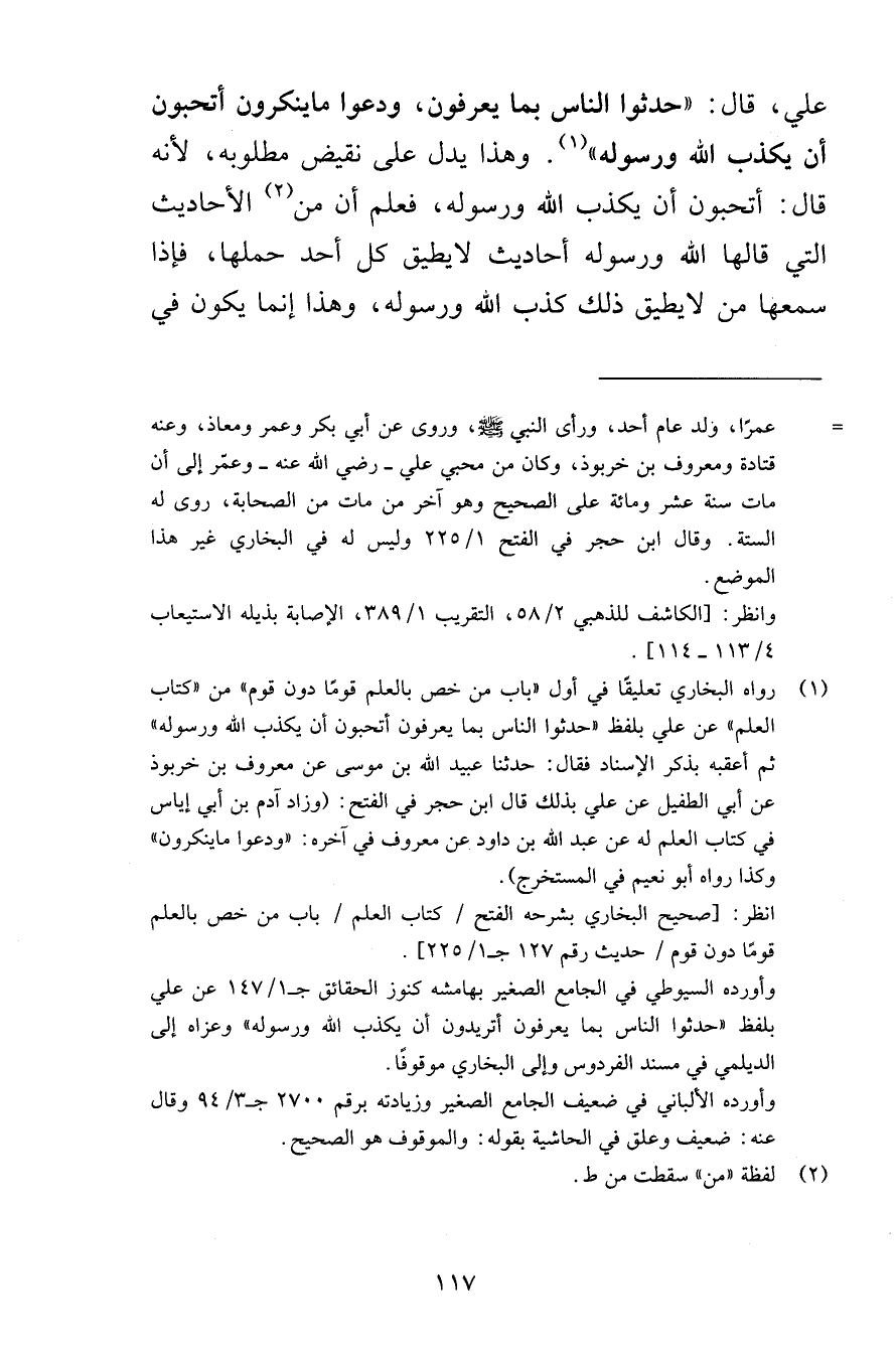 علي قال حدثوا الناس بما يعرفون ودعوا ما ينكرون أتحبون أن يكذب الله ورسوله وهذا يدل على نقيض مطلوبه لأنه قال أتحبون أن يكذب الله ورسوله فعلم أن من الأحاديث التي قالها الله ورسوله أحاديث لايطيق كل أحد حملها فإذا سمعها من لايطيق ذلك كذب الله ورسوله وهذا إنما يكون في