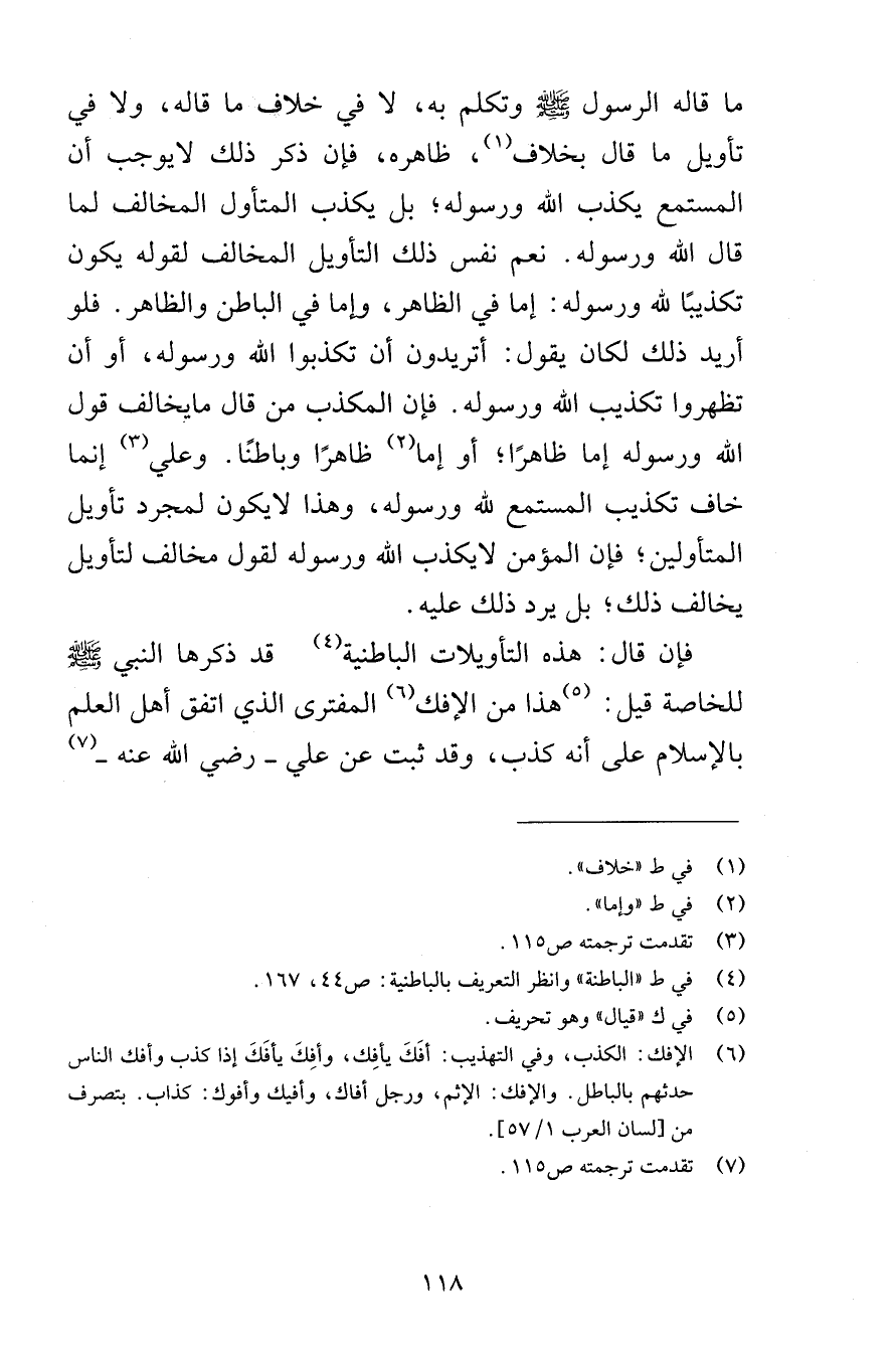 ما قاله الرسول صلى الله عليه وسلم وتكلم به لا في خلاف ما قاله ولا في تأويل ما قال بخلاف ظاهره فإن ذكر ذلك لايوجب أن المستمع يكذب الله ورسوله نعم نفس ذلك التأويل المخالف لقوله يكون تكذيبًا لله ورسوله إما في الظاهر وإما في الباطن والظاهر فلو أريد ذلك لكان يقول أتريدون أن تكذبوا الله ورسوله أو أن تظهروا تكذيب الله ورسوله فإن المكذب من قال مايخالف قول الله ورسوله إما ظاهرًا وإما ظاهرًا وباطنًا وعلي إنما خاف تكذيب المستمع لله ورسوله وهذا لا يكون لمجرد تأويل المتأولين فإن المؤمن لايكذب الله ورسوله لقول مخالف لتأويل يخالف ذلك بل يرد ذلك عليه فإن قال هذه التأويلات الباطنية قد ذكرها النبي صلى الله عليه وسلم للخاصة قيل هذا من الإفك المفترى الذي اتفق أهل العلم بالإسلام على أنه كذب وقد ثبت عن علي رضي الله عنه