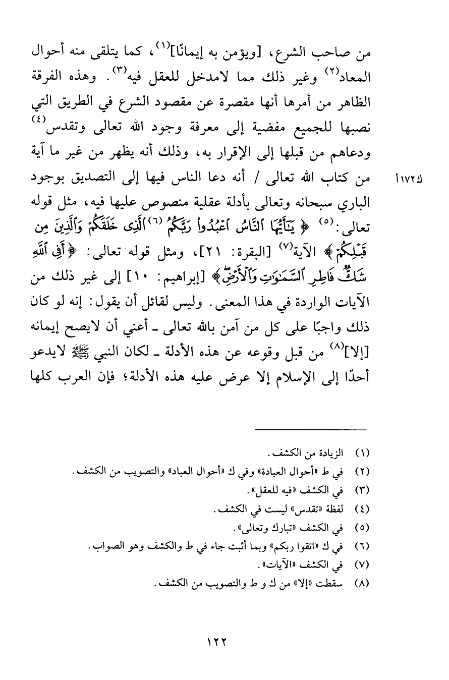 من صاحب الشرع ويؤمن به إيمانًا كما يتلقى منه أحوال المعاد وغير ذلك مما لامدخل للعقل فيه وهذه الفرقة الظاهر من أمرها أنها مقصرة عن مقصود الشرع في الطريق التي نصبها للجميع مفضية إلى معرفة وجود الله تعالى وتقدس ودعاهم من قبلها على الإقرار به وذلك أنه يظهر من غير ما آية من كتاب الله تعالى أنه دعا الناس فيها إلى التصديق بوجود الباري سبحانه وتعالى بأدلة عقلية منصوص عليها فيه مثل قوله تعالى يَا أَيُّهَا النَّاسُ اعْبُدُواْ رَبَّكُمُ الَّذِي خَلَقَكُمْ وَالَّذِينَ مِن قَبْلِكُمْ لَعَلَّكُمْ تَتَّقُونَ {21} [البقرة 21] ومثل قوله تعالى أَفِي اللهِ شَكٌّ فَاطِرِ السَّمَاوَاتِ وَالأَرْضِ [إبراهيم 10] إلى غير ذلك من الآيات الواردة في هذا المعنى وليس لقائل أن يقول إنه لو كان ذلك واجبًا على كل من آمن بالله تعالى أعني أن لايصح إيمانه إلا من قبل وقوعه عن هذه الأدلة لكان النبي صلى الله عليه وسلم لايدعو أحدًا إلى الإسلام إلا عرض عليه هذه الأدلة فإن العرب كلها