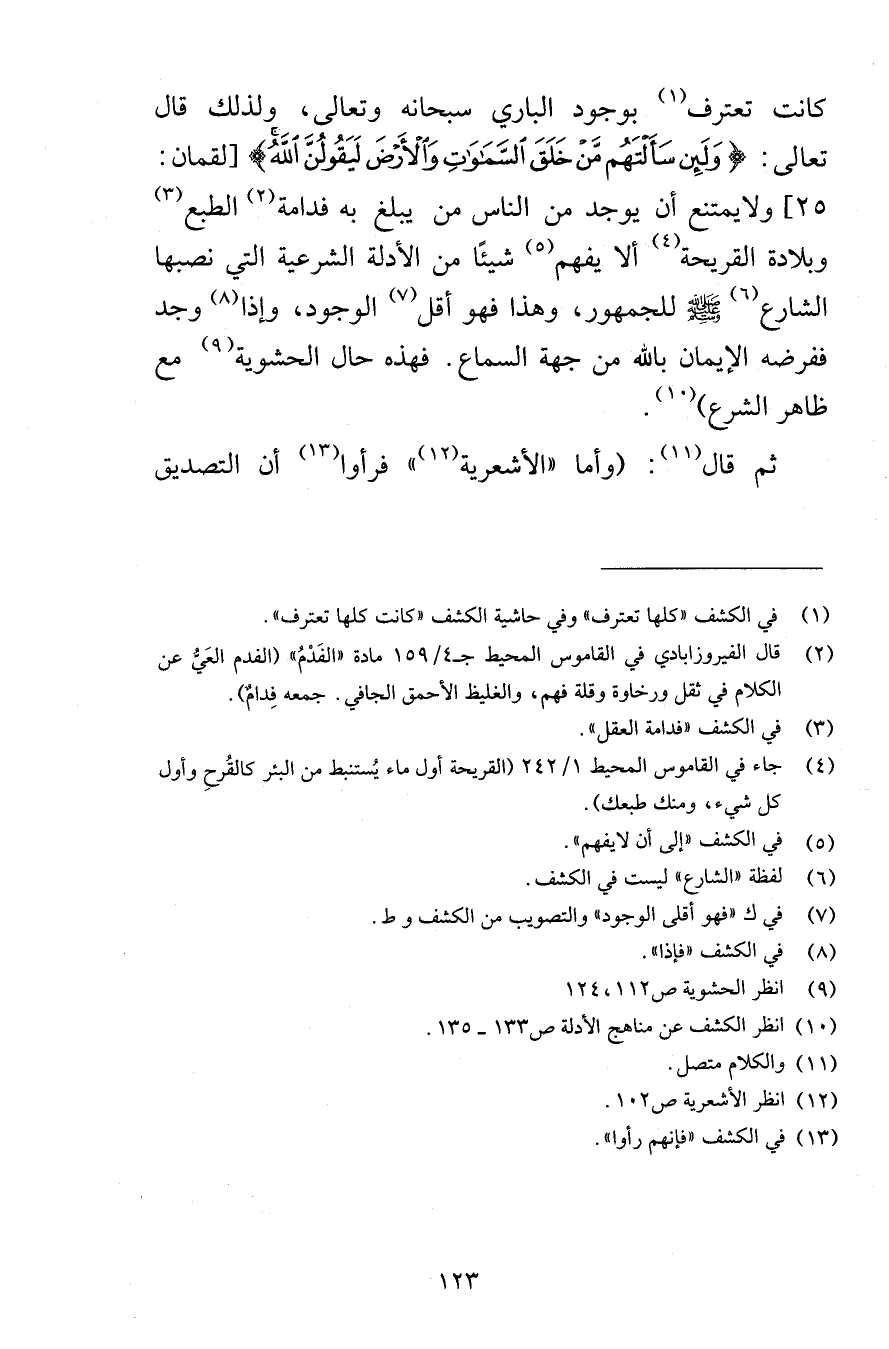 كانت تعترف بوجود الباري سبحانه وتعالى ولذلك قال تعالى وَلَئِن سَأَلْتَهُم مَّنْ خَلَقَ السَّمَاوَاتِ وَالْأَرْضَ لَيَقُولُنَّ اللَّهُ [لقمان 25] ولايمتنع أن يوجد من الناس من يبلغ به فدامة الطبع وبلادة القريحة ألا يفهم شيئًا من الأدلة الشرعية التي نصبها الشارع صلى الله عليه وسلم للجمهور وهذا فهو أقل الوجود وإذا وجد ففرضه الإيمان بالله من جهة السماع فهذه حال الحشوية مع ظاهر الشرع ثم قال وأما الشعرية فرأوا أن التصديق