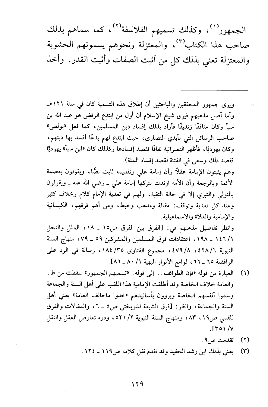 الجمهور وكذلك تسميهم الفلاسفة كما سماهم بذلك صاحب هذا الكتاب والمعتزلة ونحوهم يسمونهم الحشوية والمعتزلة تعني بذلك كلمن أثبت الصفات وأثبت القدر وأخذ