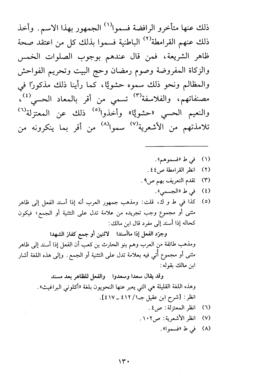 ذلك عنها متأخرو الرافضة فسموا الجمهور بهذا الاسم وأخذ ذلك عنهم القرامطة الباطنية فسموا بذلك كل من اعتقد صحة ظاهر الشريعة فمن قال عندهم بوجوب الصلوات الخمس والزكاة المفروضة وصوم رمضان وحج البيت وتحريم الفواحش والمظالم ونحو ذلك سموه حشويًّا كما رأينا ذلك مذكورًا في مصنفاتهم والفلاسفة تسمي من أقر بالمعاد الحسي والنعيم الحسي حشويًّا وأخذوا ذلك عن المعتزلة تلامذتهم من الأشعرية سموا من أقروا بما ينكرونه من