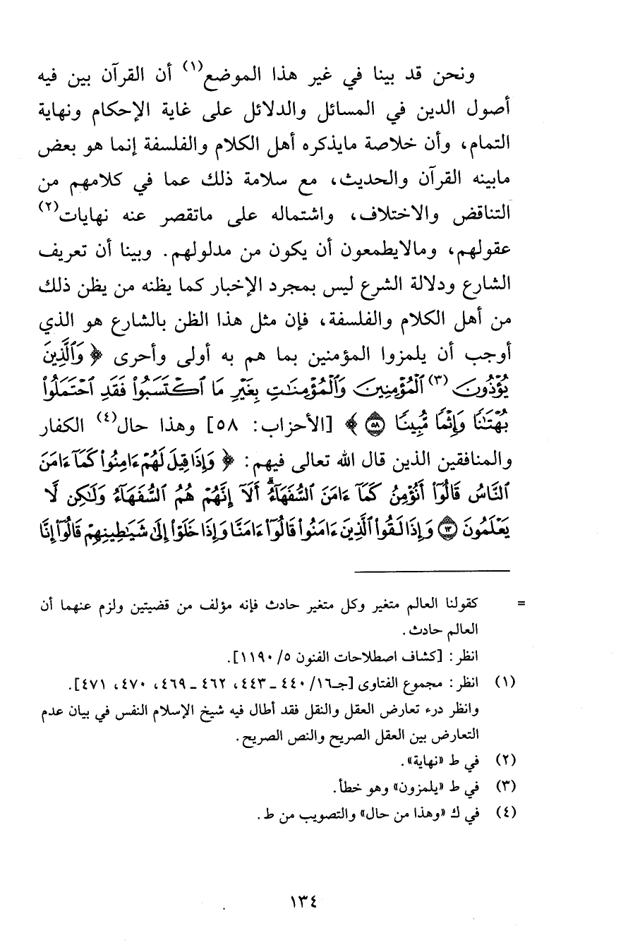 ونحن قد بينا في غير هذا الموضع أن القرآن بين فيه أصول الدين في المسائل والدلائل على غاية الإحكام ونهاية التمام وأن خلاصة مايذكره أهل الكلام والفلسفة إنما هو بعض مابينه القرآن والحديث مع سلامة ذلك عما في كلامهم من التناقض والاختلاف واشتماله عما تقصر عنه نهايات عقولهم ومالايطمعون أن يكون من مدلولهم وبينا أن تعريف الشارع ودلالة الشرع ليس بمجرد الإخبار كما يظنه من يظن ذلك من أهل الكلام والفلسفة فإن مثل هذا الظن بالشارع هو الذي أوجب أن يلمزوا المؤمنين بما هو أولى وأحرى وَالَّذِينَ يُؤْذُونَ الْمُؤْمِنِينَ وَالْمُؤْمِنَاتِ بِغَيْرِ مَا اكْتَسَبُوا فَقَدِ احْتَمَلُوا بُهْتَاناً وَإِثْماً مُّبِيناً {58} [الأحزاب 58] وهذا حال الكفار والمنافقين الذين قال الله تعالى فيهم وَإِذَا قِيلَ لَهُمْ آمِنُواْ كَمَا آمَنَ النَّاسُ قَالُواْ أَنُؤْمِنُ كَمَا آمَنَ السُّفَهَاء أَلا إِنَّهُمْ هُمُ السُّفَهَاء وَلَكِن لاَّ يَعْلَمُونَ {13} وَإِذَا لَقُواْ الَّذِينَ آمَنُواْ قَالُواْ آمَنَّا وَإِذَا خَلَوْاْ إِلَى شَيَاطِينِهِمْ قَالُواْ إِنَّا