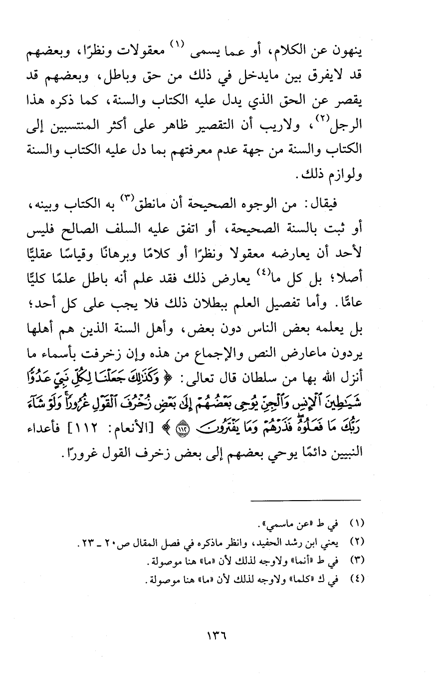 ينهون عن الكلام أو عما يسمى معقولات ونظرًا وبعضهم قد لايفرق بين مايدخل في ذلك من حق وباطل وبعضهم قد يقصر عن الحق الذي يدل عليه الكتاب والسنة كما ذكره هذا الرجل ولاريب أن التقصير ظاهر على أكثر المنتسبين إلى الكتاب والسنة من جهة عدم معرفتهم بما دل عليه الكتاب والسنة ولوازم ذلك فيقال من الوجوه الصحيحة أن مانطق به الكتاب وبينه أو ثبت بالسنة الصحيحة أو اتفق عليه السلف الصالح فليس لأحد أن يعارضه معقولا ونظرًا أو كلامًا وبرهانًا وقياسًا عقليًّا أصلا بل كل ما يعارض ذلك فقد علم أنه باطل علمًا كليًّا عامًّا وأما تفصيل العلم ببطلان ذلك فلا يجب على كل أحد بل يعلمه بعض الناس دون بعض وأهل السنة الذين هم أهلها يردون ماعارض النص والإجماع من هذه وإن زخرفت بأسماء ما أنزل الله بها من سلطان قال تعالى وَكَذَلِكَ جَعَلْنَا لِكُلِّ نِبِيٍّ عَدُوّاً شَيَاطِينَ الإِنسِ وَالْجِنِّ يُوحِي بَعْضُهُمْ إِلَى بَعْضٍ زُخْرُفَ الْقَوْلِ غُرُوراً وَلَوْ شَاء رَبُّكَ مَا فَعَلُوهُ فَذَرْهُمْ وَمَا يَفْتَرُونَ {112} [الأنعام 112] فأعداء النبيين دائمًا يوحي بعضهم إلى بعض زخرف القول غرورًا