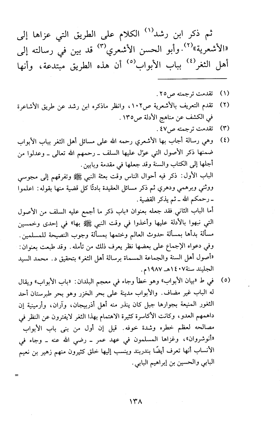 ثم ذكر ابن رشد الكلام على الطريق التي عزاها إلى الأشعرية وأبو الحسن الأشعري قد بين في رسالته إلى أهل الثغر بباب الأبواب أن هذه الطريق مبتدعة وأنها
