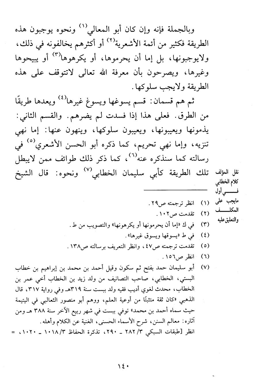 وبالجملة فإنه وإن كان أبو المعالي ونحوه يوجبون هذه الطريقة فكثير من أئمة الأشعرية أو أكثرهم يخالفونه في ذلك ولايوجبونها بل إما يحرموها أو يكرهوها أو يبيحوها وغيرها ويصرحون بأن معرفة الله تعالى لاتتوقف على هذه الطريقة ولايجب سلوكها ثم هم قسمان قسم يسوغها ويسوغ غيرها ويعدها طريقًا من الطرق فعلى هذا إذا فسدت لم يضرهم والقسم الثاني يذمونها ويعيبونها ويعيبون سلوكها وينهون عنها إما نهي تنزيه وإما نهي تحريم كما ذكره أبو الحسن الأشعري في رسالته كما سنذكره عنه كما ذكر ذلك طوائف ممن لايبطل تلك الطريقة كأبي سليمان الخطابي ونحوه قال الشيخ