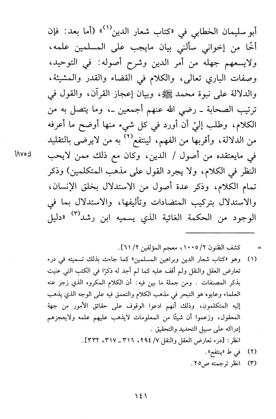 أبو سليمان الخطابي في كتاب شعار الدين أما بعد فإن أخًا من إخواني سألني بيان مايجب على المسلمين علمه ولايسعهم جهله من أمر الدين وشرح أصوله في التوحيد وصفات الباري تعالى والكلام في القضاء والقدر والمشيئة والدلالة على نبوة محمد صلى الله عليه وسلم وبيان إعجاز القرآن والقول في ترتيب الصحابة رضي الله عنهم أجمعين وما يتصل به من الكلام وطلب إليّ أن أورد في كل شيء منها أوضح ما أعرفه من الدلالة وأقربها من الفهم لينتفع به من لايرضى بالتقليد في مايعتقده من أصول الدين وكان مع ذلك ممن لايحب النظر في الكلام ولا يجرد القول على مذهب المتكلمين وذكر تمام الكلام وذكر عدة أصول من الاستدلال بخلق الإنسان والاستدلال بتركيب المتضادات وتأليفها والاستدلال بما في الوجود من الحكمة الغائية الذي يسميه ابن رشد دليل