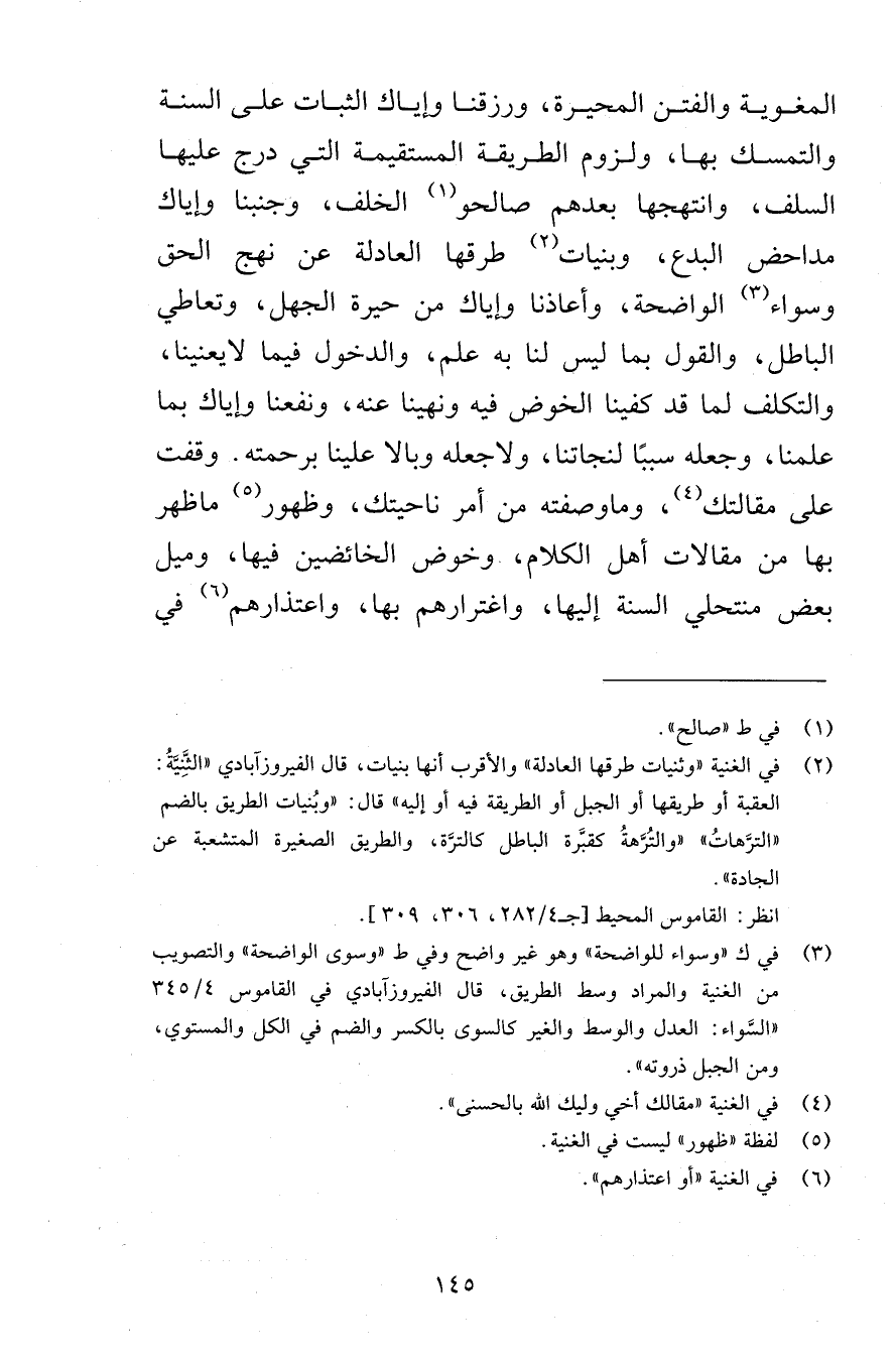 المغوية والفتن المحيرة ورزقنا وإياك الثبات على السنة والتمسك بها ولزوم الطريقة المستقيمة التي درج عليها السلف وانتهجها بعدهم صالح الخلف وجنبنا وإياك مداحض البدع وبنيات طرقها العادلة عن نهج الحق وسواء الواضحة وأعاذنا وإياك من حيرة الجهل وتعاطي الباطل والقول بما ليس لنا به علم والدخول فيما لايعنينا والتكلف لما قد كفينا الخوض فيه ونهينا عنه ونفعنا وإياك بما علمنا وجعله سببًا لنجاتنا ولاجعله وبالا علينا برحمته وقفت على مقالتك وماوصفته من أمر ناحيتك وظهور ماظهر بها من مقالات أهل الكلام وخوض الخائضين فيها وميل بعض منتحلي السنة إليها واغترارهم بها واعتذارهم في