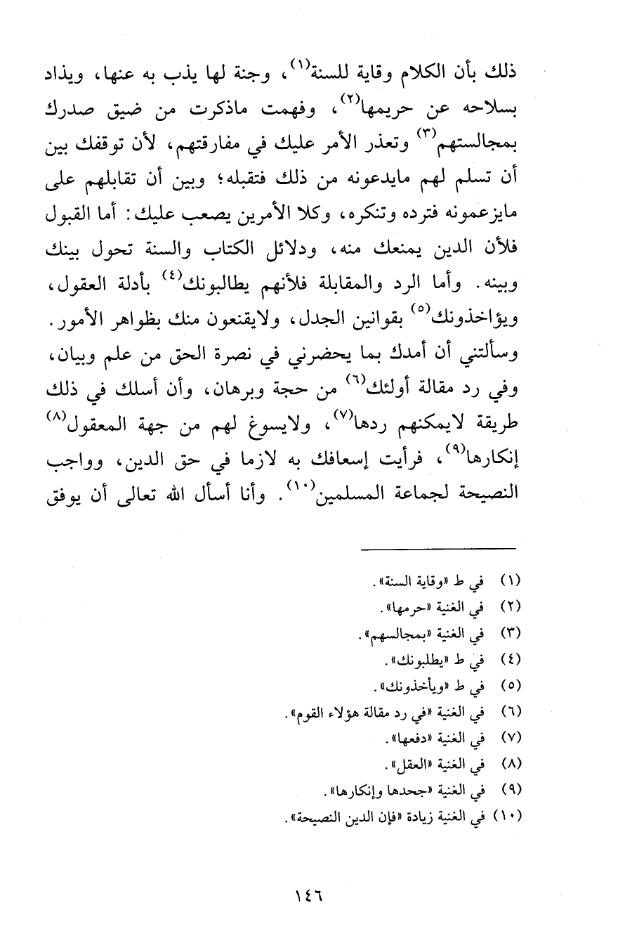 ذلك بأن الكلام وقاية للسنة وجنة لها يذب به عنها ويذاد بسلاحه عن حريمها وفهمت ماذكرت من ضيق صدرك بمجالستهم وتعذر الأمر عليك في مفارقتهم لأن توقفك بين أن تسلم لهم مايدعونه من ذلك فتقبله وبين أن تقابلهم على مايزعمونه فترده وتنكره وكلا الأمرين يصعب عليك أما القبول فلأن الدين يمنعك منه ودلائل الكتاب والسنة تحول بينك وبينه وأما الرد والمقابلة فلأنهم يطالبونك بأدلة العقول ويؤاخذونك بقوانين الجدل ولايقنعون منك بظواهر الأمور وسألتني أن أمدك بما يحضرني في نصرة الحق من علم وبيان وفي رد مقالة أولئك من حجة وبرهان وأن أسلك في ذلك طريقة لايمكنهم ردها ولايسوغ لهم من جهة المعقول إنكارها فرأيت إسعافك به لازما في حق الدين وواجب النصيحة لجماعة المسلمين وأنا أسأل الله تعالى أن يوفق