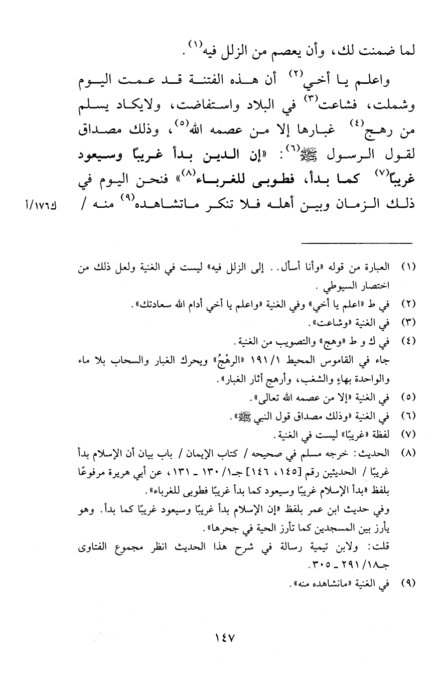لما ضمنت لك وأن يعصم من الزلل فيه واعلم يا أخي أن هذه الفتنة قد عمت اليوم وشملت فشاعت في البلاد واستفاضت ولايكاد يسلم من رهج غبارها إلا من عصمه الله وذلك مصداق لقول الرسول صلى الله عليه وسلم إن الدين بدأ غريبًا وسيعود غريبًا كما بدأ فطوبى للغرباء فنحن اليوم في ذلك الزمان وبين وأهله فلا تنكر ما تشاهده منه