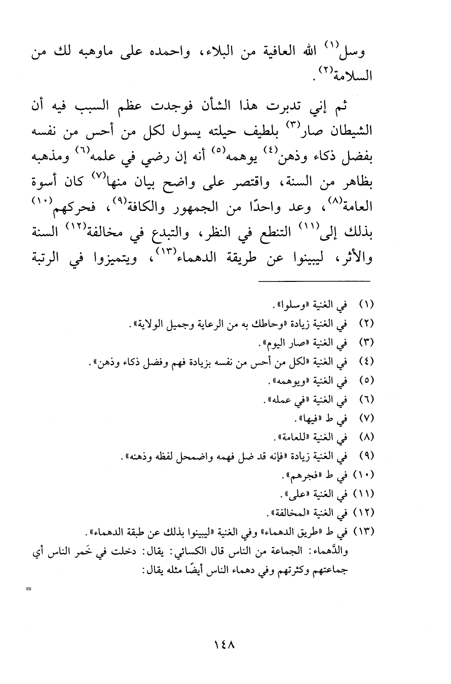 وسل الله العافية من البلاء واحمده على ماوهبه لك من السلامة ثم إني تدبرت هذا الشأن فوجدت عظم السبب فيه أن الشيطان صار بلطيف حيلته يسول لكل من أحس من نفسه بفضل ذكاء وذهن يوهمه أنه إن رضي في علمه ومذهبه بظاهر من السنة واقتصر على واضح بيان منها كان أسوة العامة وعد واحدًا من الجمهور والكافة فحركهم بذلك إلى التنطع في النظر والتبدع في مخالفة السنة والأثر ليبينوا عن طريقة الدهماء ويتميزوا في الرتبة