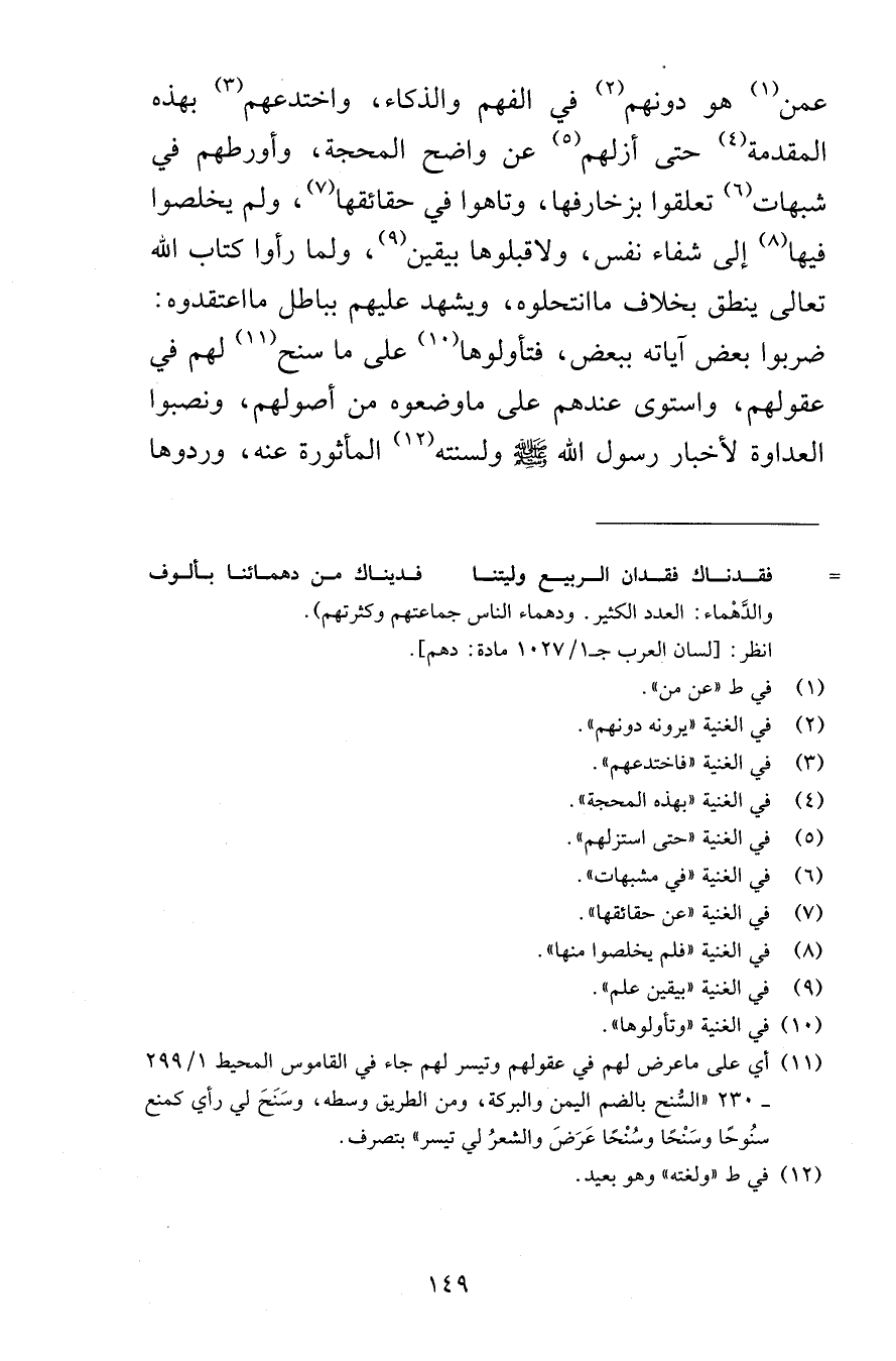 عمن هو دمنهم في الفهم والذكاء واختدعهم بهذه المقدمة حتى أزلهم عن واضح المحجة وأورطهم في شبهات تعلقوا بزخارفها وتاهوا في حقائقها ولم يخلصوا فيها إلى شفاء نفس ولاقبلوها بيقين ولما رأوا كتاب الله تعالى ينطق بخلاف ماانتحلوه ويشهد عليهم بباطل مااعتقدوه ضربوا بعض آياته ببعض فتأولوها على ما سنح لهم في عقولهم واستوى عندهم على ماوضعوه من أصولهم ونصبوا العداوة لأخبار رسول الله صلى الله عليه وسلم ولسنته المأثورة عنه وردوها