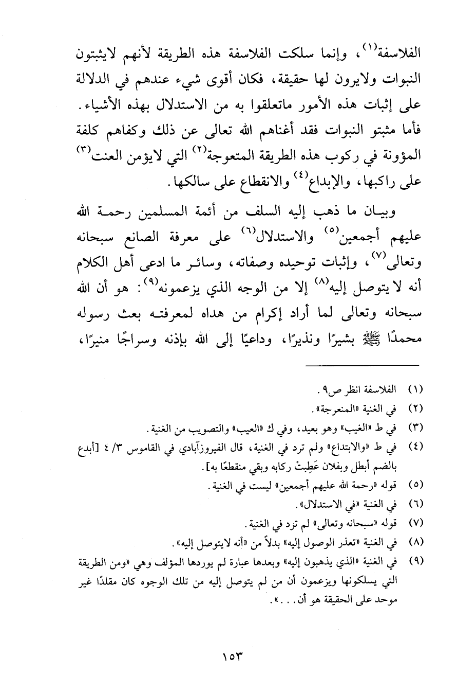 الفلاسفة وإنما سلكت الفلاسفة هذه الطريقة لأنهم لايثبتون النبوات ولايرون لها حقيقة فكان أقوى شيء عندهم في الدلالة على إثبات هذه الأمور ماتعلقوا به من الاستدلال بهذه الأشياء فأما مثبتو النبوات فقد أغناهم الله تعالى عن ذلك وكفاهم كلفة المؤونة في ركوب هذه الطريقة المتعوجة التي لايؤمن العنت على راكبها والإبداع والانقطاع على سالكها وبيان ما ذهب إليه السلف من أئمة المسلمين رحمة الله عليهم أجمعين والاستدلال على معرفة الصانع سبحانه وتعالى وإثبات توحيده وصفاته وسائر ما ادعى أهل الكلام أنه لايتوصل إليه إلا من الوجه الذي يزعمونه هو أن الله سبحانه وتعالى لما أراد إكرام من هداه لمعرفته بعث رسوله محمدًا صلى الله عليه وسلم بشيرًا ونذيرًا وداعيًا إلى الله بإذنه وسراجًا منيرًا