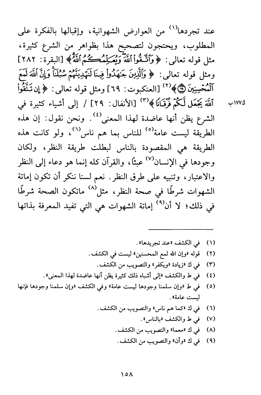 عند تجردها من العوارض الشهوانية وإقبالها بالفكرة على المطلوب ويحتجون لتصحيح هذا بظواهر من الشرع كثيرة مثل قوله تعالى وَاتَّقُواْ اللهَ وَيُعَلِّمُكُمُ اللهُ [البقرة 282] ومثل قوله تعالى وَالَّذِينَ جَاهَدُوا فِينَا لَنَهْدِيَنَّهُمْ سُبُلَنَا وَإِنَّ اللَّهَ لَمَعَ الْمُحْسِنِينَ {69} [العنكبوت 69] ومثل قوله تعالى إَن تَتَّقُواْ اللهَ يَجْعَل لَّكُمْ فُرْقَاناً [الأنفال 29] إلى أشياء كثيرة في الشرع يظن أنها عاضدة لهذا المعنى ونحن نقول إن هذه الطريقة ليست عامة للناس بما هم ناس ولو كانت هذه الطريقة هي المقصودة بالناس لبطلت طريقة النظر ولكان وجودها في الإنسان عبثًا والقرآن كله إنما هو دعاء إلى النظر والاعتبار وتنبيه على طرق النظر نعم لسنا ننكر أن تكون إماتة الشهوات شرطًا في صحة النظر مثل ماتكون الصحة شرطًا في ذلك لا أن إماتة الشهوات هي التي تفيد المعرفة بذاتها