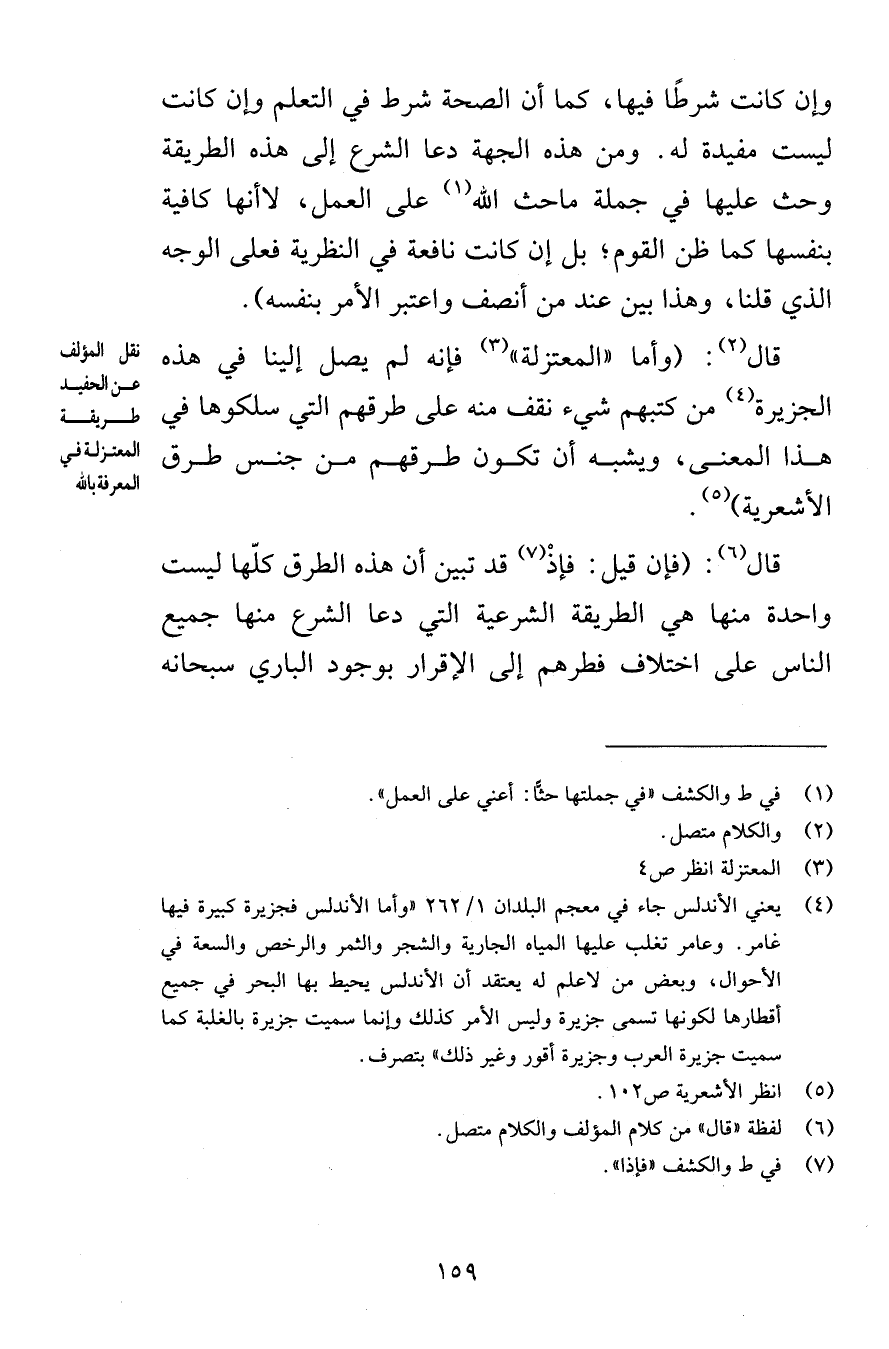 وإن كانت شرطًا فيها كما أن الصحة شرط في التعلم وإن كانت ليست مفيدة له ومن هذه الجهة دعا الشرع إلى هذه الطريقة وحث عليها في جملة ماحث الله على العمل لاأنها كافية بنفسها كما ظن القوم بل إن كانت نافعة في النظرية فعلى الوجه الذي قلنا وهذا بين عند من أنصف واعتبر الأمر بنفسه قال وأما المعتزلة فإنه لم يصل إلينا في هذه الجزيرة من كتبهم شيء نقف منه على طرقهم التي سلكوها في هذا المعنى ويشبه أن تكون طرقهم من جنس طرق الأشعرية قال فإن قيل فإذْ قد تبين أن هذه الطرق كلّها ليست واحدة منها هي الطريقة الشرعية التي دعا الشرع منها جميع الناس على اختلاف فطرهم إلى الإقرار بوجود الباري سبحانه