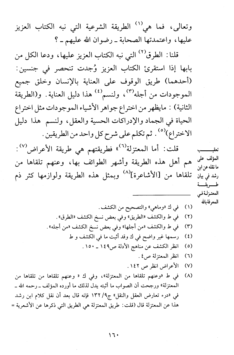 وتعالى فما هي الطريقة الشرعية التي نبه الكتاب العزيز عليها واعتمدتها الصحابة رضوان الله عليهم قلنا الطرق التي نبه الكتاب العزيز عليها ودعا الكل من بابها إذا استقرئ الكتاب العزيز وُجدت تنحصر في جنسين أحدهما طريق الوقوف على العناية بالإنسان وخلق جميع الموجودات من أجله ولنسم هذا دليل العناية والطريقة الثانية مايظهر من اختراع جواهر الأشياء الموجودات مثل اختراع الحياة في الجماد والإدراكات الحسية والعقل ولنسم هذا دليل الاختراع ثم تكلم على شرح كل واحد من الطريقين قلت أما المعتزلة فطريقتهم هي طريقة الأعراض هم أهل هذه الطريقة وأشهر الطوائف بها وعنهم تلقاها من تلقاها من الأشاعرة وبمثل هذه الطريقة ولوازمها كثر ذم